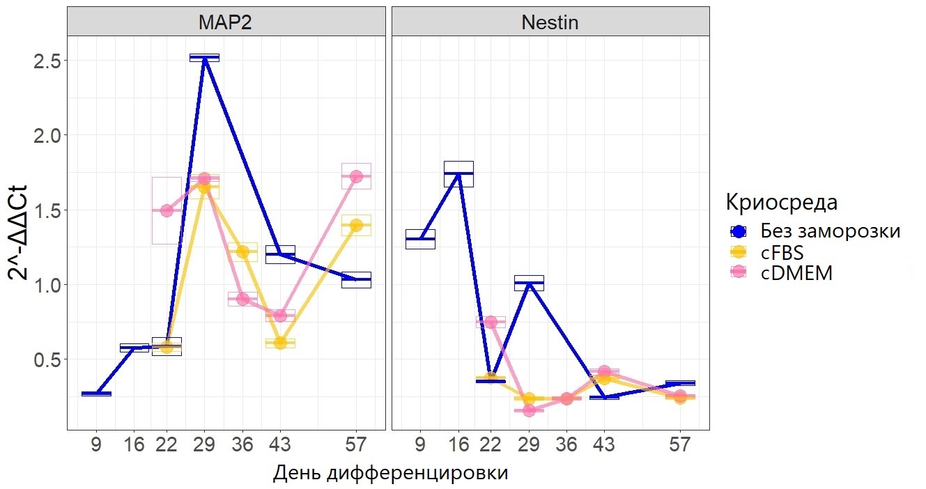 По истечении срока культивации после разморозки, а также в течение всего срока культивации интактных нейросфер органоиды лизировали с помощью буфера ExtractRNA («Евроген», Россия) и выделяли РНК в соответствии с протоколом производителя. Качество выделенной РНК оценивали путём электрофореза в 0,7% агарозном геле. Концентрацию РНК измеряли с использованием набора Equalbit BR для анализа РНК (Vazyme, Китай) и флуориметра Qubit (Invitrogen, США). РНК обрабатывали ДНКазой I (NEB, Великобритания) в соответствии с протоколом производителя. Для синтеза комплементарной ДНК с матрицы РНК использовали набор MMLV RT kit («Евроген», Россия) в соответствии с протоколом производителя. Для проведения количественной полимеразной цепной реакции (ПЦР) на одну лунку 96-луночного планшета (SSI Bio, США) добавляли 5 мкл готовой смеси для ПЦР 5х qPCRmix-HS SYBR («Евроген», Россия), 1 мкл раствора праймера 10 мкМ (табл. 2), 18,2 мкл воды и 1 мкл матрицы комплементарной ДНК. В контрольные лунки планшета вместо матрицы комплементарной ДНК добавляли 1 мкл воды для ПЦР («Евроген», Россия). Реакцию проводили при использовании термоциклера для амплификации нуклеиновых кислот 1000 CFX Manager исполнения C10000 Touch (Bio-Rad, США) и программного обеспечения CFX Manager. Количество циклов — 39. Результаты анализировали в программе MS EXCEL-2108 (Microsoft, США) по методу ΔΔCt [41]. В качестве контроля для метода использовали образец незамороженных нейросфер от 9-го дня дифференцировки.