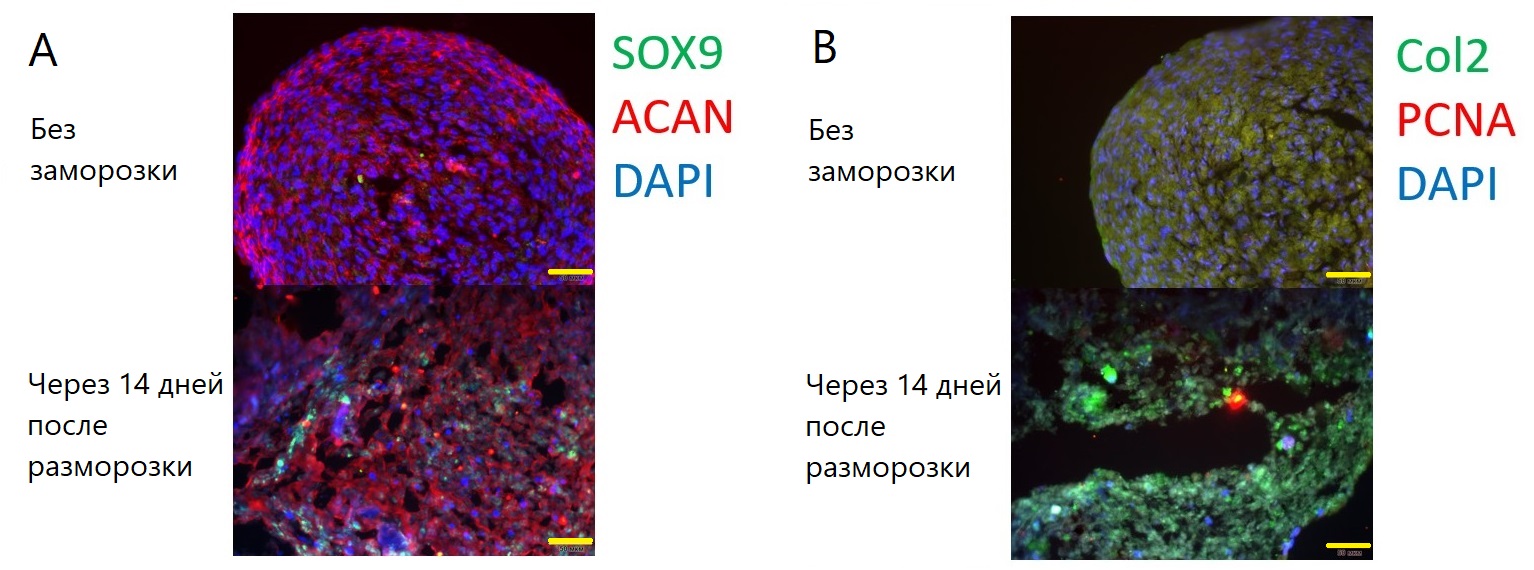 В другой работе хондросферы, полученные из ЭСК, были криоконсервированы в шести различных коммерческих средах [35]. Авторы оценивали жизнеспособность органоидов через 4 ч после разморозки без анализа экспрессии белков матрикса после разморозки. Известно, что высокие концентрации DMSO являются токсичными для суставного хряща, однако исследований по уменьшению концентрации DMSO для криоконсервации хрящей не проводилось [36]. Таким образом, ряд вопросов, связанных с криоконсервацией хондросфер, остаётся не до конца изученным.