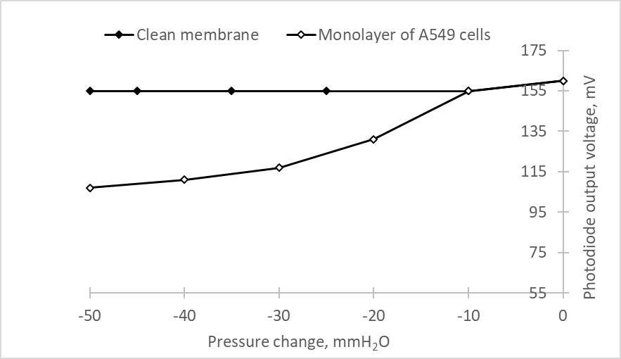 Fig. 4 shows standard relationship of sensor readings and the negative pressure applied to the liquid beneath the membrane. The pressure is generated by creating a height differential between the liquid in the reservoir beneath the membrane and that in the connected movable vessel. Therefore, the pressure on the graph is expressed in cmH2O. As the pressure decreases, the cells protrude more from the liquid surface, resulting in less reflected laser beam detected by the photodiode. At a negative pressure of 2 cmH2O and below, it can be observed that the cells visually protrude above the liquid layer on the membrane surface. For a clean membrane surface, light scattering and pressure variation actually do not correlate. All further experiments were conducted at a negative pressure of 2 cmH2O applied to the liquid beneath the membrane, unless otherwise specified.
