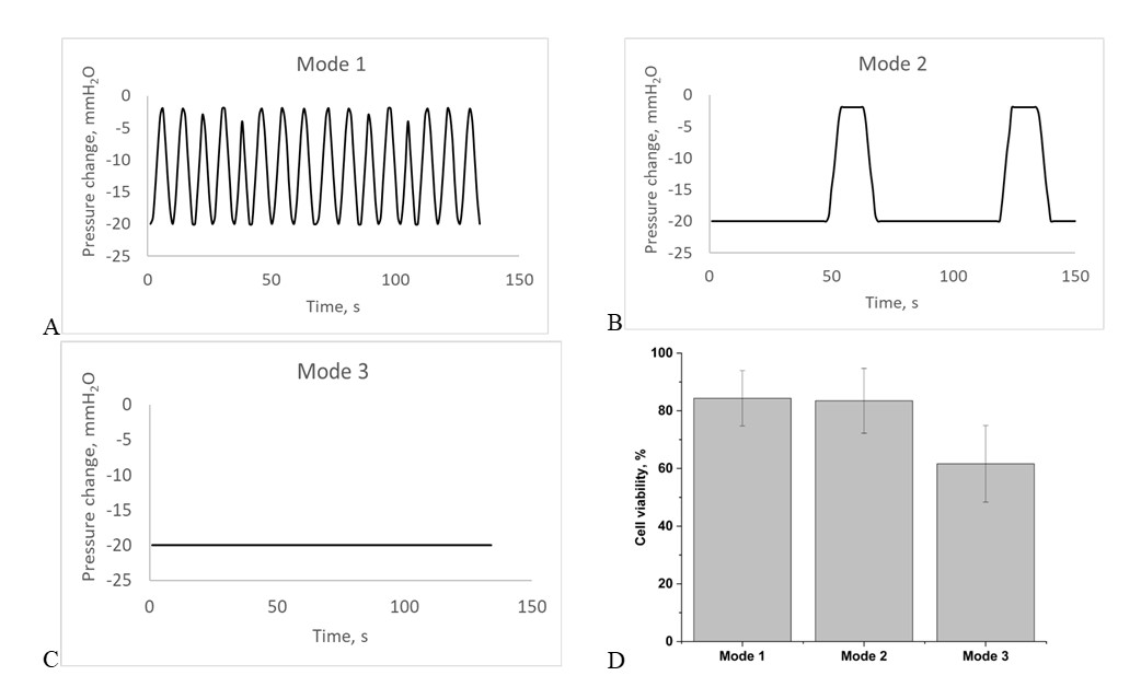 Рис. 10. Испытание режимов работы камеры с периодическим изменением давления: a–c — различные паттерны изменения давления (mode 1–3); d — жизнеспособность культуры клеток А549 через 60 мин экспозиции в камере.