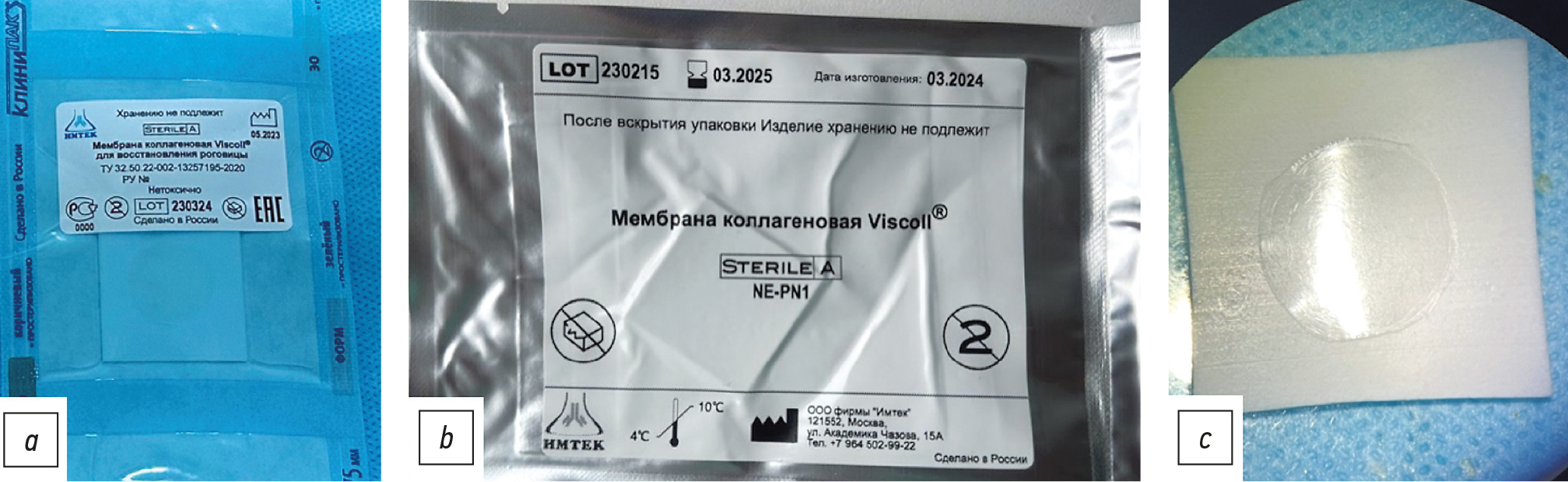 Рис. 1. Первичная (a) и вторичная (b) герметичная упаковка коллагенового материала; c — снимок изготовленной коллагеновой мембраны.
