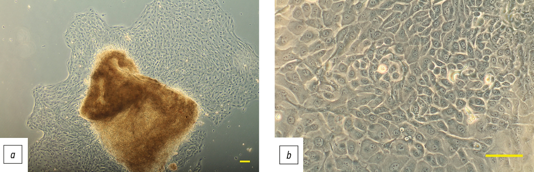 Рис. 2. Первичная культура эпителиальных клеток конъюнктивы при миграции из экспланта: a — эпителиальные клетки на поверхности культурального планшета на 4-й день; b — эпителиальные клетки на поверхности культурального планшета на 7-й день, монослой клеток в виде «булыжной мостовой» с высоким ядерно-цитоплазматическим соотношением. Бар 100 мкм.