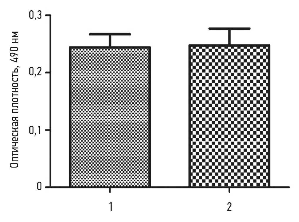Рис. 6. Графическое отображение результатов колориметрического формазанового теста: 1 — метаболическая активность клеток на пластике; 2 — метаболическая активность клеток на коллагеновой мембране с концентрацией коллагена 30 мг/мл.