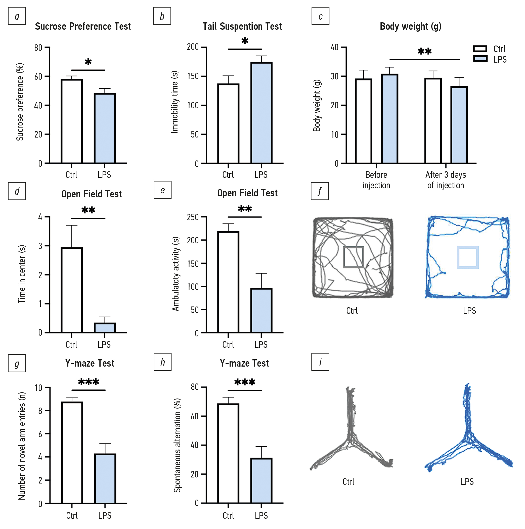 Fig. 2. Effect of LPS treatment on mice behavior and body weight: a, sucrose preference in the SPT; b, immobility time in the TST; c, body weight of mice before and at 3 days of injections; d, time in the center in the OFT; e, ambulatory activity in the OFT; f, representative tracks of mice in the OFT; g, novel arm entries in the Y-maze test; h, spontaneous alternation in the Y-maze test; i, representative tracks of mice in the Y-maze test. LPS, lipopolysaccharide; Ctrl, control group; n = 9/10 (Ctrl/LPS) for b, h, i; n = 10/9 (Ctrl/LPS) for c–f. Data are presented as mean values ± SEM; * p ≤ 0.05, ** p ≤ 0.01, *** p ≤ 0.001 (t-test, Mann–Whitney test, ANOVA).