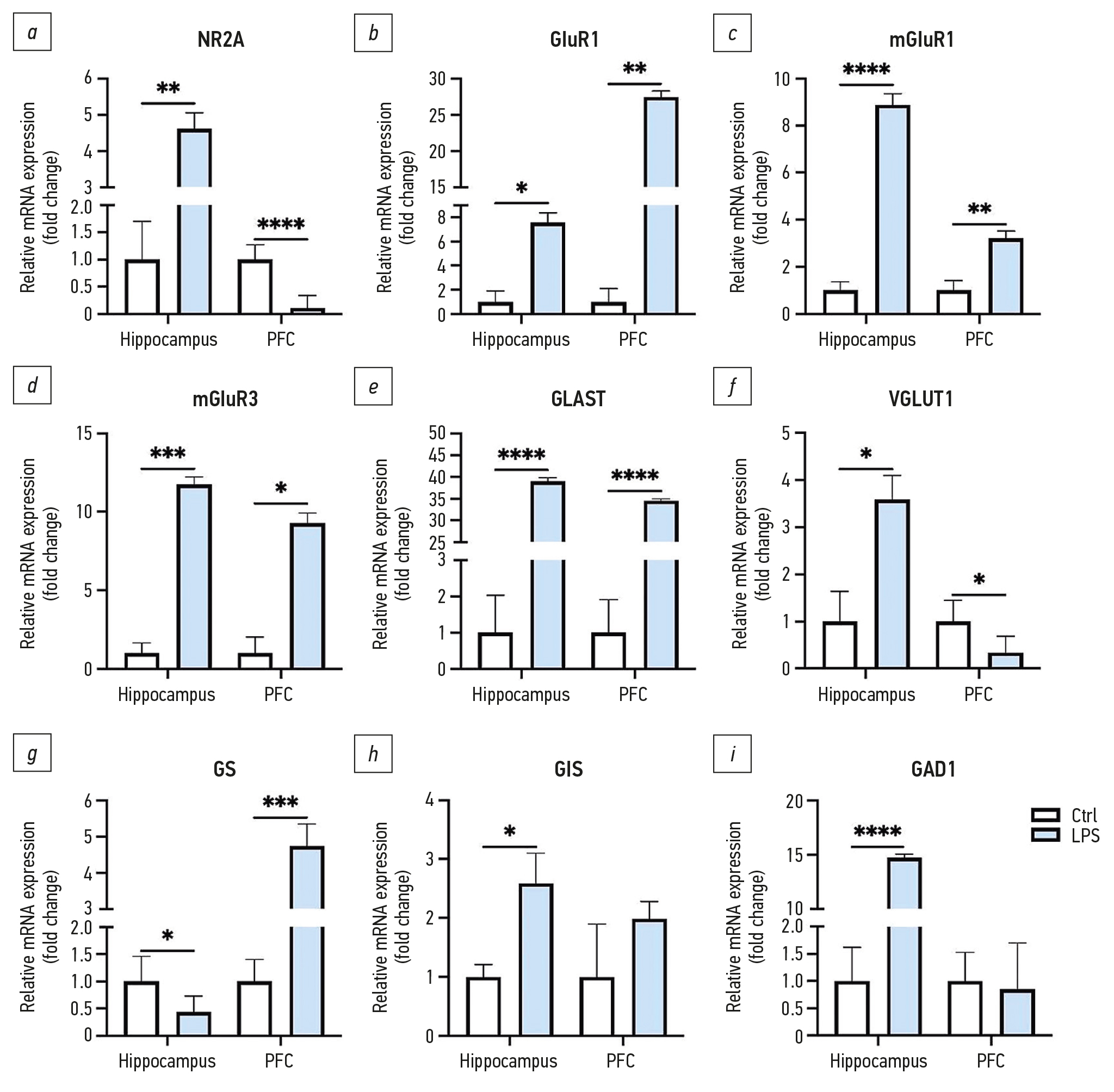 Рис. 9. Уровни экспрессии рецепторов и транспортеров глутамата/ГАМК и генов, связанных с метаболизмом глутамата, в гиппокампе и префронтальной коре мышей в ответ на хроническое введение LPS: a–i — уровни экспрессии генов. LPS — липополисахарид, Ctrl — контрольная группа, mRNA — матричная рибонуклеиновая кислота, NR2A — субъединица 2A глутаматного ионотропного рецептора NMDA, GluR1 — субъединица 1 глутаматного ионотропного рецептора AMPA, mGluR1 — глутаматный метаботропный рецептор 1, mGluR3 — глутаматный метаботропный рецептор 3, GLAST — глутаматный/аспартатный транспортер 1, VGLUT1 — везикулярный глутаматный транспортер 1, GS — глутамат синтетаза (глутамат-аммиак лигаза), Gls — глутаминаза, GAD1 — глутамат декарбоксилаза 1, PFC — префронтальная кора; n = 9/10 (Ctrl/LPS). Данные представлены как средние ± SEM; * p ≤ 0,05; ** p ≤ 0,01; *** p ≤ 0,001; **** p ≤ 0,0001 (t-тест, тест Манна–Уитни).