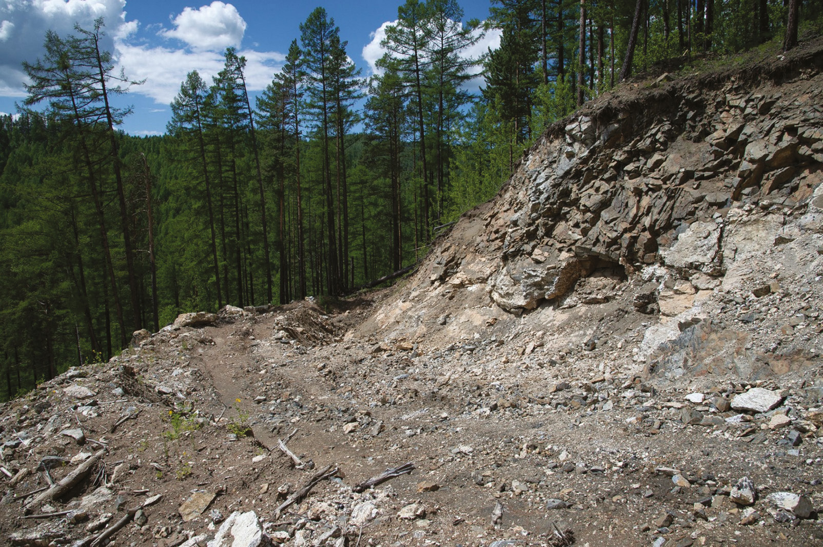 При всем обилии литературы о Малханском поле нам не удалось найти в открытых источниках сколько-нибудь подробной информации о пегматитовой жиле Крутая, где был найден изученный в настоящей статье кристалл. Между тем, это одна из самых первых по времени открытия жил: она была обнаружена экспедицией «Сосновгеология» в 1981 г., т. е. до открытия самого пегматитового поля. В середине 1980-х гг. экспедицией «Байкалкварцсамоцветы» было пройдено несколько канав (рис. 3), выявивших в ней бедную турмалиновую минерализацию. Видимо, с этим связано отсутствие серьезного интереса к этому объекту: ювелирный и коллекционный материал, в отличие от вышеназванных высокопродуктивных жил, здесь не обнаружен. В связи с отсутствием опубликованных работ, посвященных жиле Крутая, ее описание дано по материалам геологического отчета, составленного специалистами компании ООО «Технология» (Иванов, Чуев, 2021).