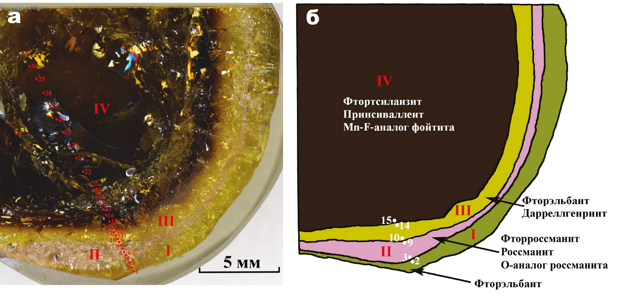 Символы минералов в легенде окрашены по цветам зон, к которым они относятся. Здесь и на рис. 7 и 8: 1 – фторэльбаит, зона I; 2 – фторроссманит, зона II; 3 – O2–-аналог россманита/фторроссманита, зона II; 4 – россманит, зона II; 5 – фторэльбаит, зона III; 6 – дарреллгенриит, зона III; 7 – фтортсилаизит, зона IV; 8 – принсиваллеит, зона IV; 9 – Mn2+-F-аналог фойтита, зона IV.