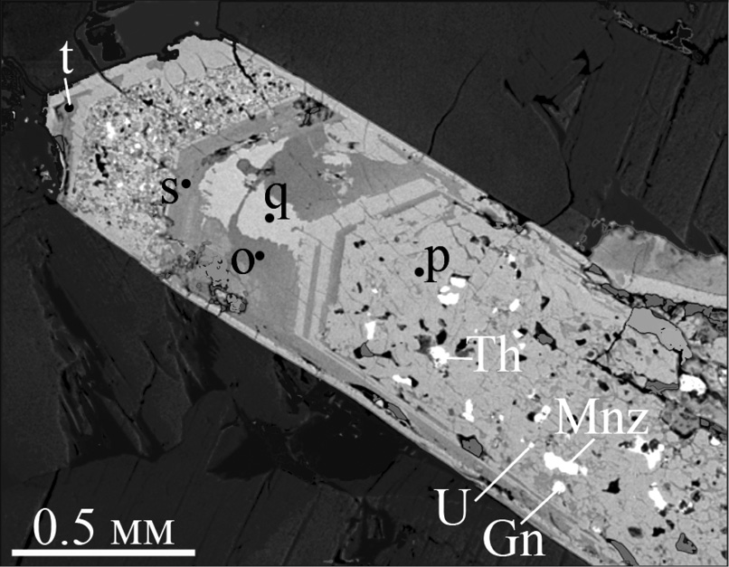 Пегматиты Ильменских гор (гранитные, сиенитовые, ультрамафитовые, карбонатитовые) являются весьма информативными для исследования онтогении разнообразных цирконов. По теме данной заметки приведем два примера. В знаменитой Блюмовской копи № 50 давно известны мелкие зеленоватые длиннопризматические цирконы из позднего парагенезиса с амазонитом, кварцем, альбитом и магнетитом. Циркон интересен анатомическим устройством, в котором заметны несколько зон с большим количеством включений мелких синхронных минералов (монацита, торита, уранинита, галенита и других), которых не видно в окружающих синхронных породообразующих минералах (рис. 9). Сам циркон в разных элементах анатомии имеет разный состав и различную микро- и нанопористость (в соответствии с метамиктностью) (рис. 9):