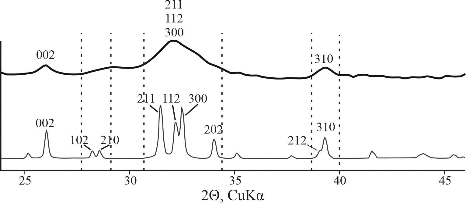 Методом прецизионной съемки получена дифрактограмма гидроксилапатита костной ткани (рис. 1). Дифрактограмма гидроксилапатита костной ткани отличается от эталонной фрагментами, где происходит наложение дифракционных пиков, дающих ложное их уширение. Самым ярким примером является область с дифракционными пиками, соответствующим плоскостям (300), (202), (211) и (112). Такое положение может влиять на расчет размеров кристаллитов, которые могут оказаться ложными. Это связано с получением неточных значений полуширины аналитического пика (FWHM), которая применяется для расчета по формуле Шеррера. Рассчитанные нами по этой формуле размеры кристаллитов составили 8.8 ± 1.6 нм в длину и 4.0 ± 0.6 нм в ширину.