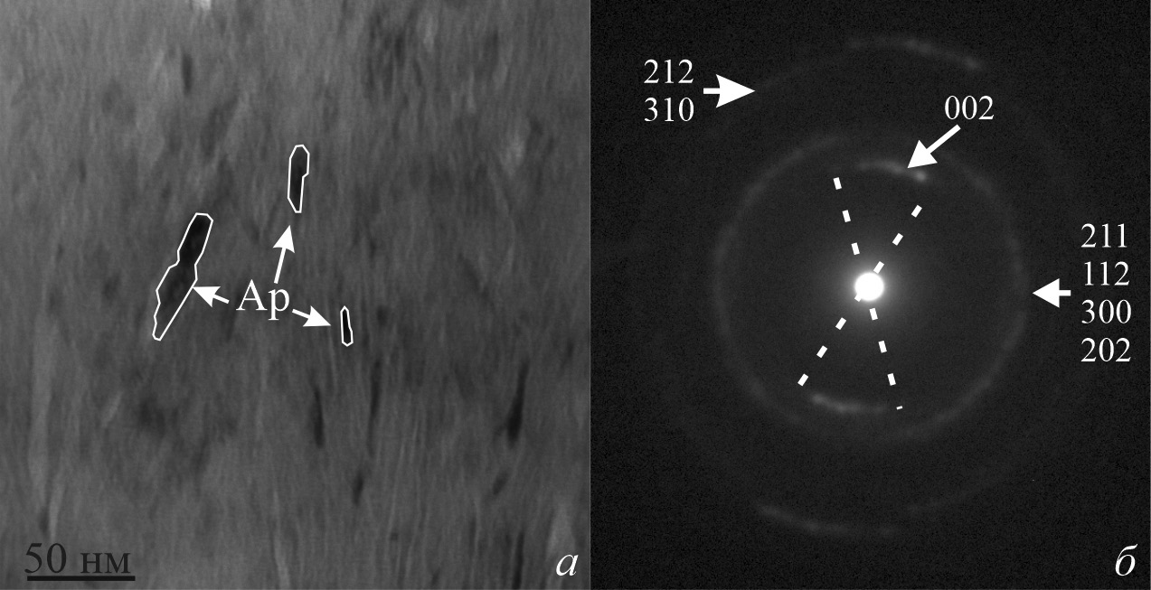 На изображениях ПЭМ в светлом поле наблюдались таблитчатые кристаллические участки гидроксилапатита (рис 2а), ориентированные субпараллельно коллагеновым фибриллам, которые, в свою очередь, направлены вдоль удлинения кости. На электронограммах фиксируется три дифракционных кольца (рис. 2б). Первое в виде двух дуг характеризует смещение положения рефлекса (002) и указывает на азимутальную разориентацию участков кристаллической фазы относительно друг друга, которая составляет порядка 30°. Поскольку семейство плоскостей (002) располагается перпендикулярно оси с элементарной ячейки кристалла, можно судить о положении отдельных кристаллов в таблитчатом кристаллическом участке гидроксилапатита. Вероятно, таблитчатые кристаллические участки гидроксилапатита являются агрегатом, в котором индивиды могут не быть параллельны и способны отклоняться на угол до 30° относительно друг друга. Второе дифракционное кольцо образуют рефлексы (211), (112), (300) и (202), третье – (310) и (212). Плотность и частота рефлексов на окружности второго и третьего кольца указывают на вариативность положения этих семейств плоскостей. Второе и третье кольца показывают, что индивиды гидроксилапатита в таблитчатом агрегате могут быть развернуты вокруг оси с на разные углы.