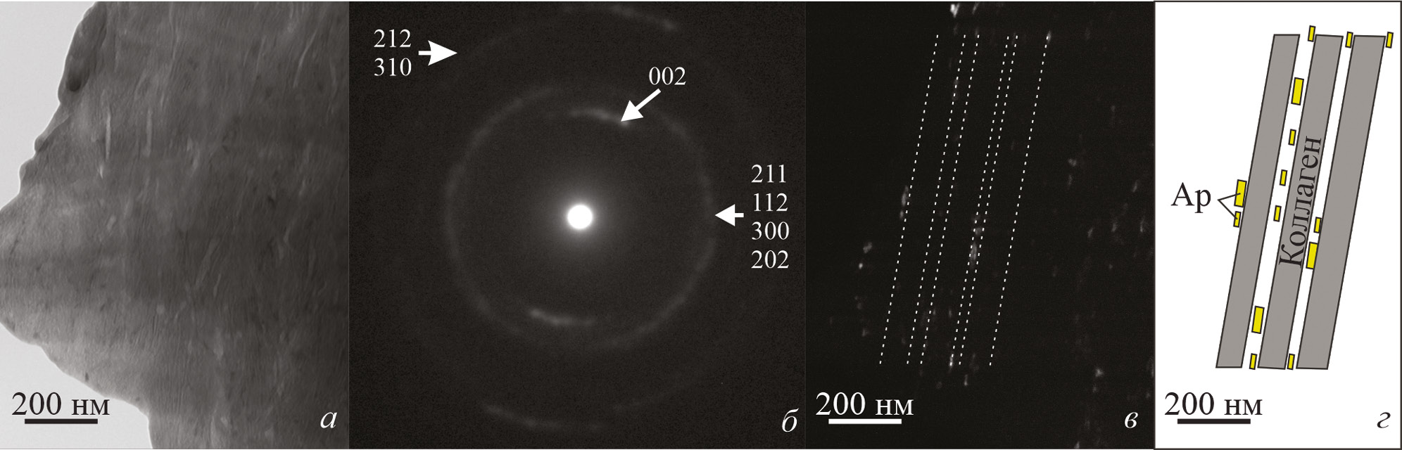 Полученные изображения костной ткани в темном поле с использованием картин дифракции от плоскостей (002) (рис. 4в) позволили измерить фактический размер таблитчатых кристаллических агрегатов гидроксилапатита (светлые участки), который варьировал от 10 × 5 до 50 × 10 нм. При этом типе съемки хорошо прослеживаются темные субпараллельно вытянутые зоны, толщина которых составляет примерно 100 нм. Их ширина и выдержанность позволяют идентифицировать их как фибриллы коллагена, в межфибриллярном пространстве которых располагаются таблитчатые агрегаты гидроксилапатита (рис. 4г).