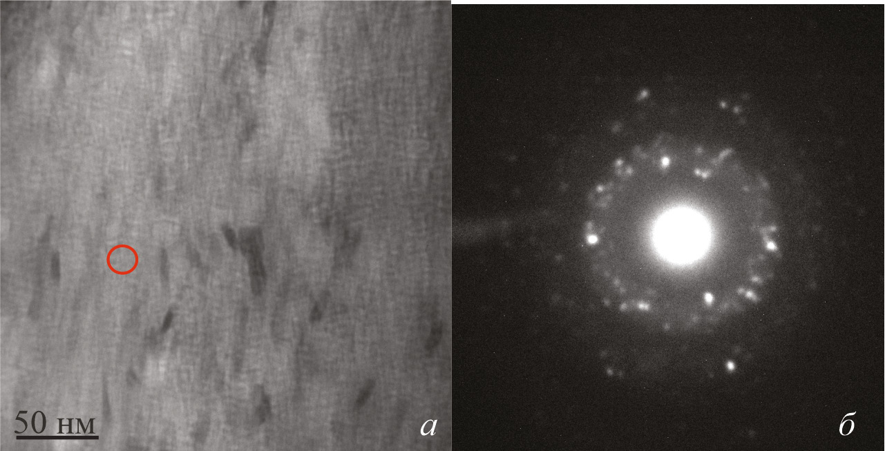 Установив размеры неорганической составляющей костной ткани и проанализировав ориентировку агрегатов и индивидов в них, мы провели нанодифракционную съемку участков, расположенных между таблитчатыми агрегатами гидроксилапатита, что позволило оценить характер кристалличности данных областей. На электроннограмме видно обилие точечных рефлексов (рис. 5б), которое указывает на то, что пространство между таблитчатыми кристаллическими агрегатами гидроксилапатита сложено наноразмерными индивидами фазы, обладающей дальним порядком.