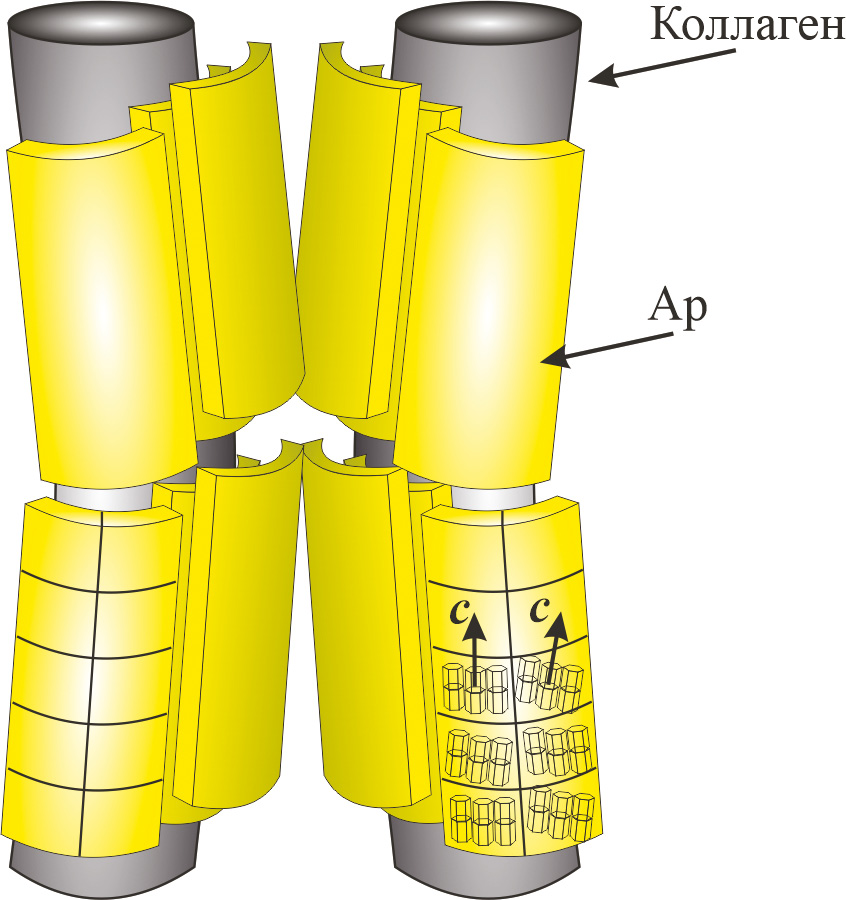Гидроксилапатит и коллаген – основные компоненты, из которых состоит костная ткань (Кораго, 1992). Коллаген – это фибриллярный белок, представляющий собой левозакрученную спираль из трех α-цепей. В костной ткани молекулы коллагена располагаются в шахматном порядке на расстоянии повторения приблизительно 70 нм (Hodge, Petrushka, 1963; Orgel et al., 2006). В модели Ходжа молекулы коллагена расположены так, что между концом одной спирали и началом следующей имеется зазор длиной примерно 40 нм. Шахматный порядок расположения молекул приводит к тому, что эти зазоры выровнены по ширине, создавая зоны разрыва. Часть исследователей склонны считать, что апатит костной ткани располагается именно в зонах разрыва молекул коллагена, иными словами, внутри фибрилл (Weiner et al., 1991; Hamed et al., 2012), другие полагают, что кристаллы гидроксилапатита присутствуют и вне фибриллярного пространства (Landis et al., 1996). При этом исследователи единодушны в том, что кристаллы гидроксилапатита ориентированы осью c вдоль удлинения коллагеновых фибрилл. Однако причины ориентированного роста кристаллов гидроксилапатита относительно коллагена до сих пор остаются предметом дискуссий (Olszta et al., 2007; Burger et al., 2008; Cantaert et al., 2013).