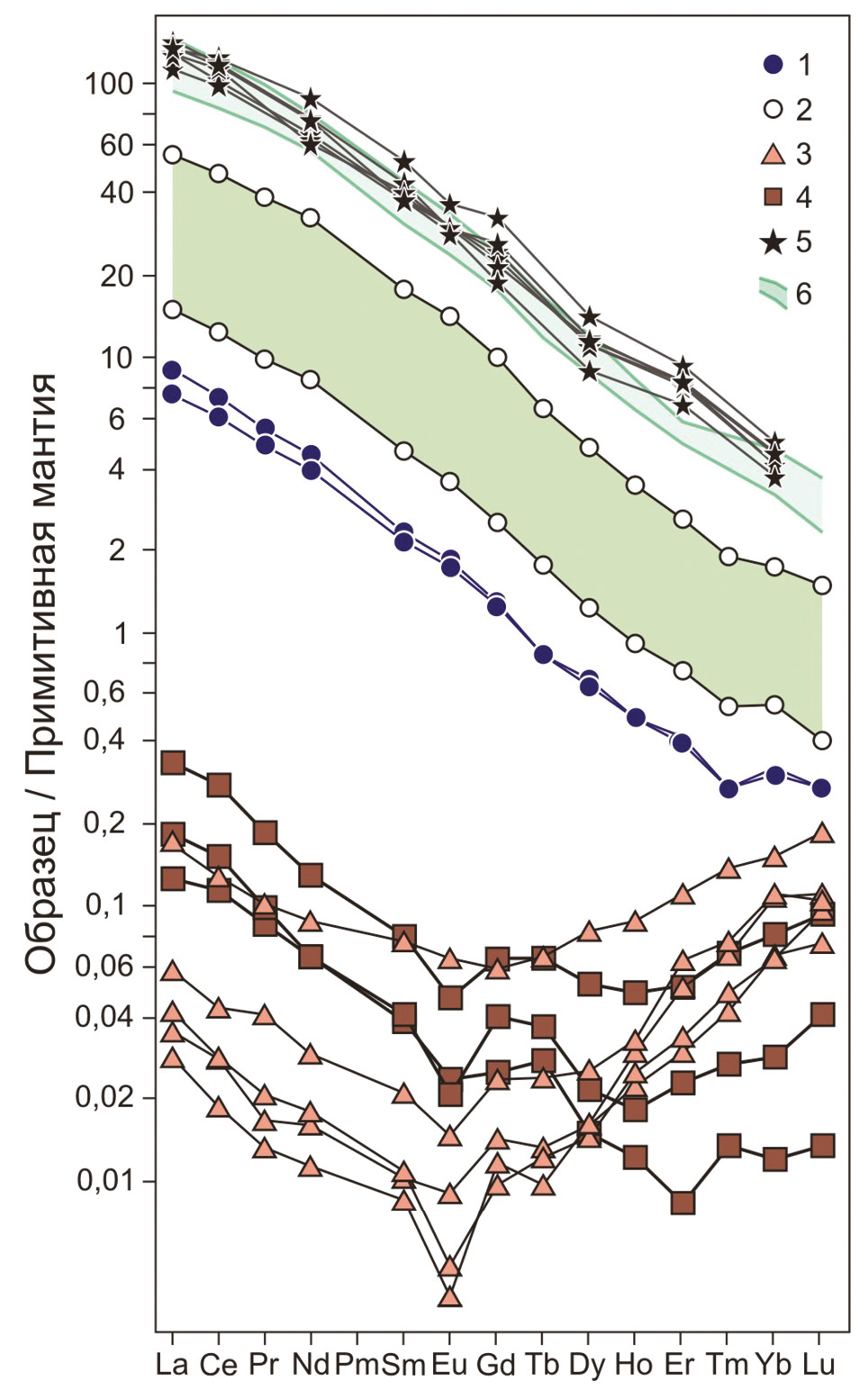 Большое значение для выяснения особенностей генезиса ультрабазитов имеют редкоземельные элементы (РЗЭ). В связи с этим, был проведен сравнительный анализ РЗЭ состава дунитов Гулинского массива с таковым для реститовых ультрабазитов Чаган-Узунского массива (офиолиты Горного Алтая) (Симонов и др., 2021) и ультраосновных пород из офиолитов Восточного Саяна (Анциферова, 2006). Спектры РЗЭ в дунитах Гулинского массива обладают отрицательным наклоном с накоплением легких лантаноидов и совпадают по форме с таковыми меймечитов, резко отличаясь от реститовых ультрабазитов из офиолитов Горного Алтая и Восточного Саяна, содержащих минимальные количества элементов и имеющих U-образную форму (рис. 3).