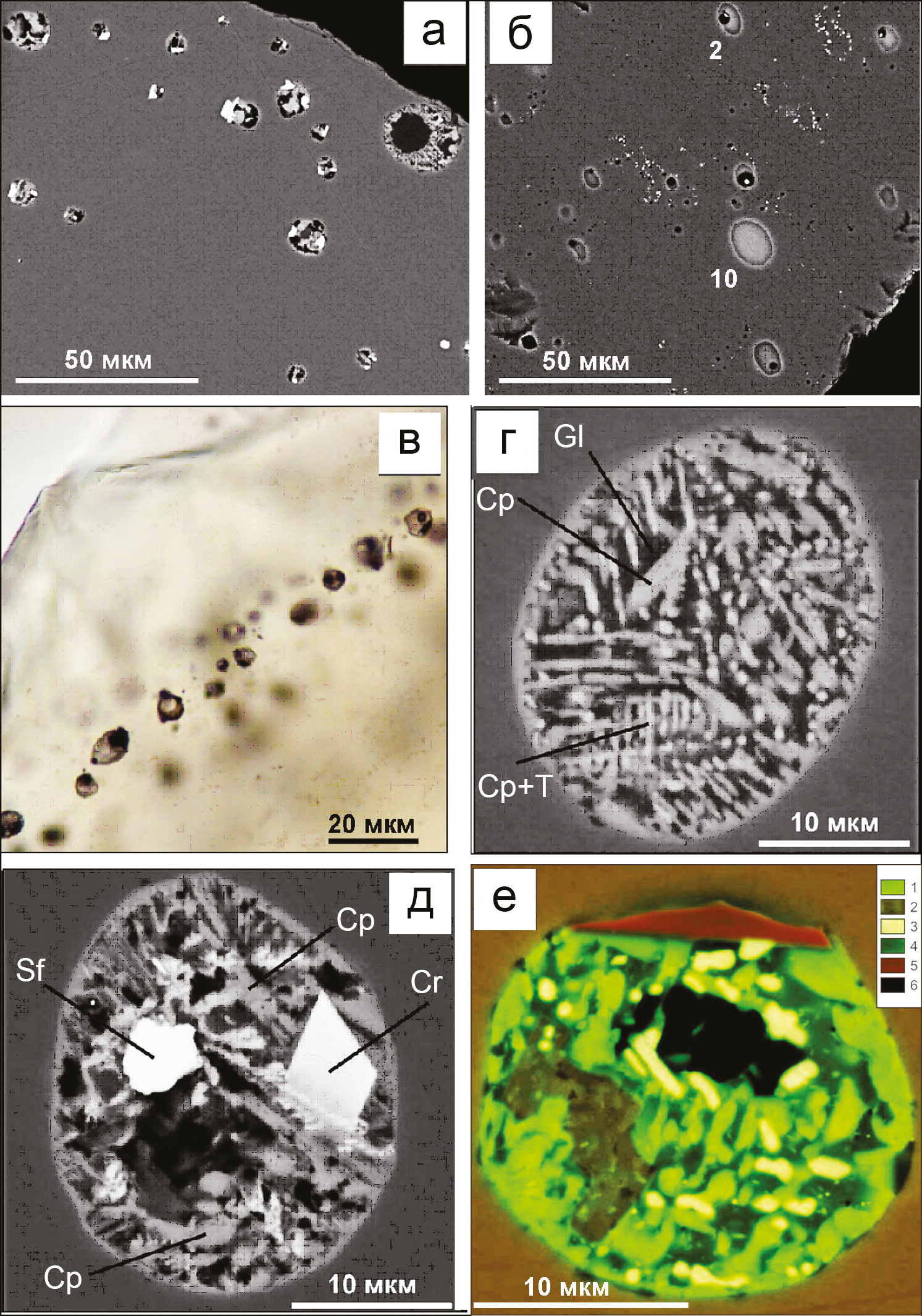 Cp – clinopyroxene, Т – titanite, Gl – glass, Cr – chromite, Sf – sulfide. 1–4 – distribution of phases used for the calculation of bulk composition of the inclusion: clinopyroxene (1), phlogopite (2), Ti-rich (16.25 wt. %) phase (3), glass (4); 5 – chromite; 6 – place of the fluid phase. Figs. а, б, г, д, е – BSE images; в – transmitted light.