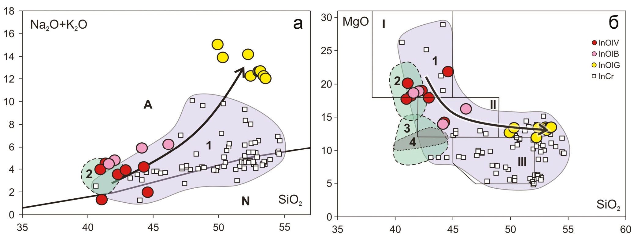 Все составы расплавных включений в оливине пересчитаны по программе PETROLOG (Danyushevsky, Plechov, 2011) (табл. 3). Данные по включениям в оливине: InOlV – валовый состав; InOlB – анализ по площади; InOlG – состав гомогенных стекловатых включений; InCr – составы расплавных включений в акцессорных хромшпинелидах из дунитов Гулинского массива. Поля составов на рис. а, б: 1 – расплавные включения в хромшпинелидах из дунитов Гулинского массива; 2 – захваченные расплавы в оливинах меймечитов – пересчитанные составы расплавных включений до равновесия с оливином-хозяином (Соболев и др., 2009); на рис. б: 3 – расплавные включения в оливине меймечитов (Соболев и др., 2009); 4 – расплавные включения в оливинах из дунитов Гулинского массива (Исакова и др., 2022). Рис. а, б – построено по данным (Петрографический..., 2009): рис. а – щелочные (A) и нормальные (N) серии пород; рис. б – поля составов пород: I – пикриты, II – пикробазальты, III – базальты. Рисунок построен на основе данных (Симонов и др., 2015, 2016, 2017).