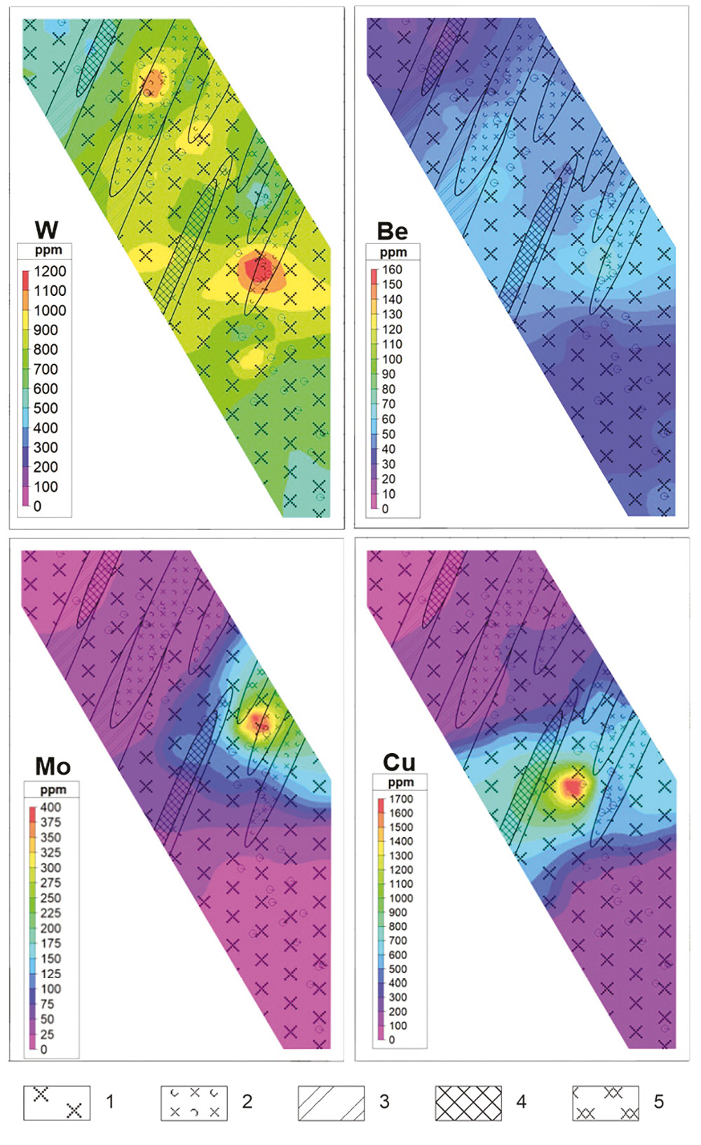 Распределение W, Mo, Be и Cu в объеме месторождения коррелирует с типом вмещающих пород, при этом конфигурация зон повышенных коцентраций согласна с простиранием пород (рис. 1, 5, 6). Наиболее высокие содержания W и Be наб-людаются в андезитах и туфах, наиболее подверженных процессам грейзенизации с образованием рудных жил. Высокие содержания Mo и Cu характерны для участков скарнирования мраморов. Отчетливая зональность распределения элементов по отношению к Юго-Коневскому гранитному массиву не обнаружена.