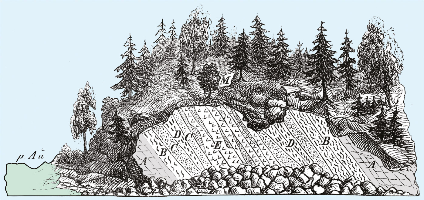 По данным разных исследователей возникли различные модели геологического строения района Шишимской копи. Первое обширное описание находится в работе И.В. Мушкетова (1877, с. 147): «…мои наблюдения несколько отличаются от наблюдений Гофмана, который говорит, что Шишимская копь заложена в тальковом сланце, залегающем в слюдяном. Описанный мною состав копи может служить указанием на весьма энергичный метаморфизм диоритовых пород, которые, изменяясь, дали начало образованию этих разнообразных сланцеватых полос, в которых выделялись отдельные минералы» (рис. 3). Схема И.В. Мушкетова внемасштабная, р. Ай находится почти в километре на запад от копи.