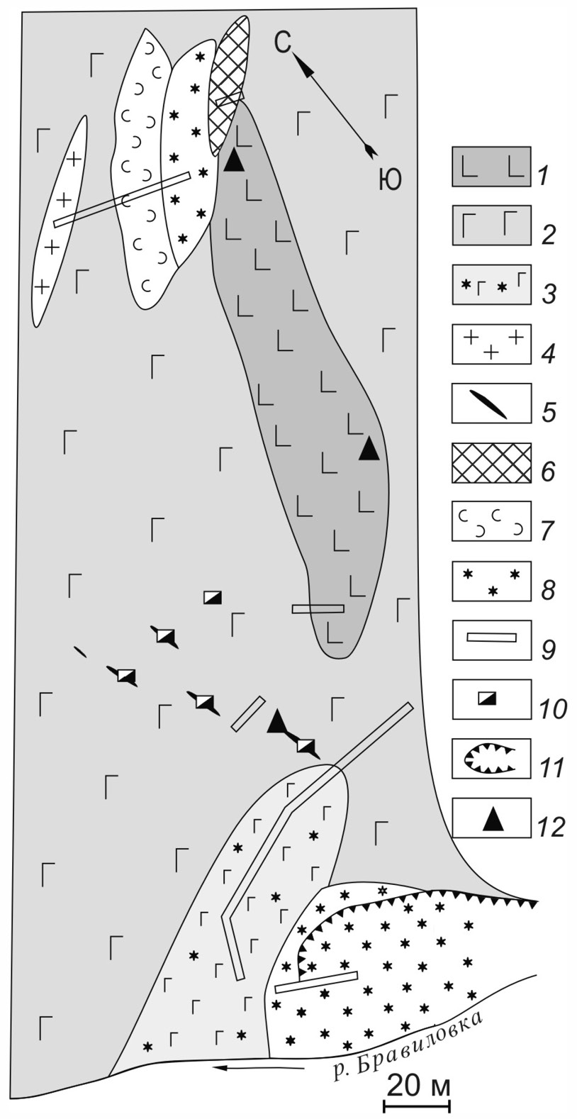 1 – pyroxenite; 2 – gabbro; 3 – skarn gabbro; 4 – granite; 5 – magnetite bodies; 6 – dolomite marble; 7 – serpentine; 8 – skarn; 9 – trenches; 10 – mines; 11– quarry; 12 – outcrops.