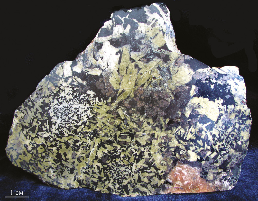 Полосчатое сложение блока разнообразных пород и наличие даек мелкозернистых габбро и гранитов указывают на существование разломной структуры в массиве габбро, где происходило формирование скарновой и карбонатитовой минерализации. Обратим внимание на то, что дайки мелкозернистых габбро и гранитов, секущие неоднородное габбро, также скарнированы. Нами в нескольких участках наблюдались тела хлоритолитов, амфибол-хлоритовых пород, магнетит-хлоритовых пород с четкими (магматическими1) границами с телами вмещающих пород. Практически во всех хлоритовых породах есть кубические, кубооктаэдрические или ромбододекаэдрические кристаллы перовскита с фрагментами индукционных поверхностей с хлоритом. В крупнозернистых друзовых агрегатах карбонатит-пегматитов встречаются срастания хлорита, диопсида, шпинели, перовскита и кальцита.