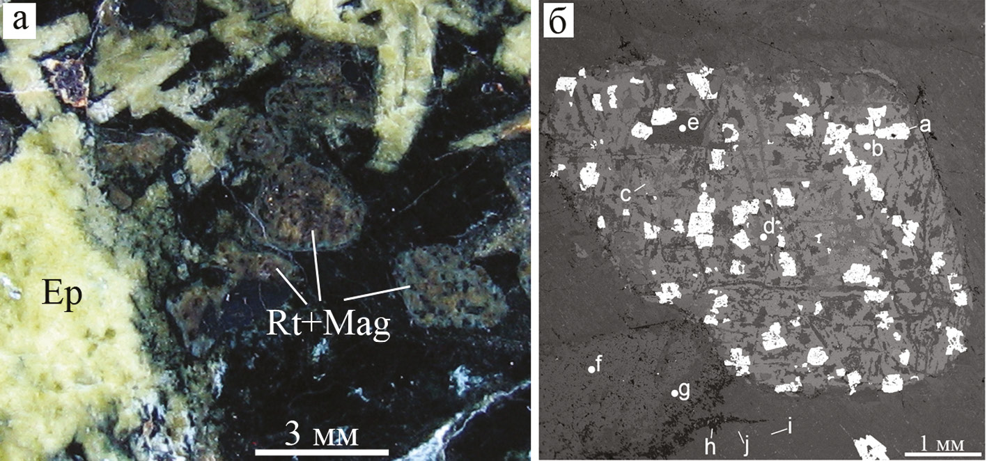 Fig. 8. Polymineral pseudomorphoses after primary titanite in gabbro: a – general view of pseudomorphoses in polished sample under oblique light; б – BSE image: a – magnetite, b – titanite, c – andradite, d – epidote, e – wincite with Cr and V, f – V-bearing epidote, i – wincite, h – albite, j – diopside-hedenbergite.