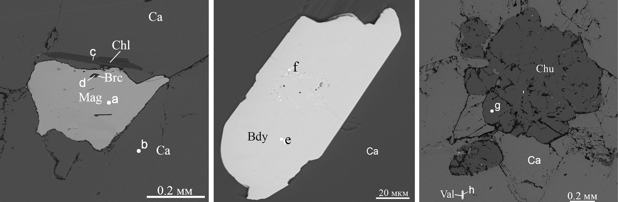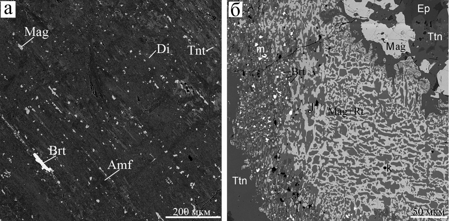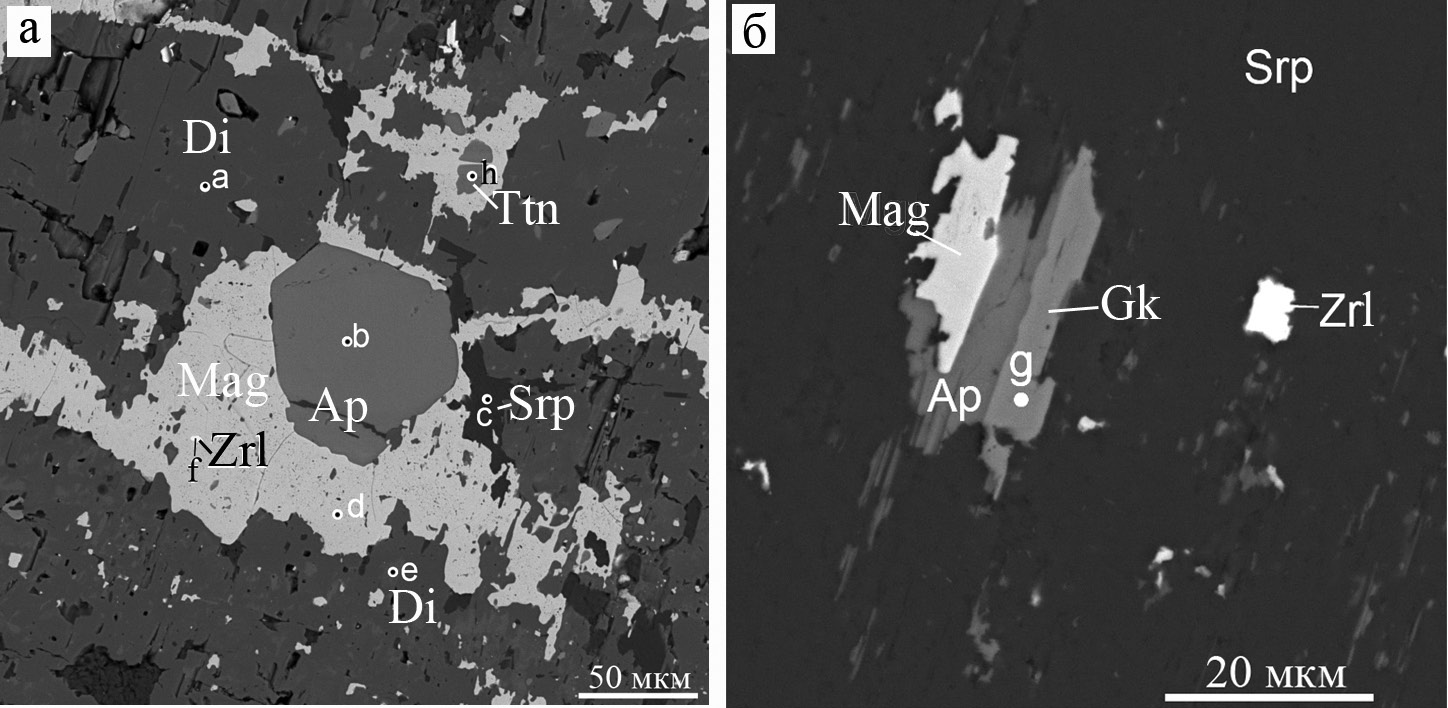 На рисунках использованы следующие аббревиатуры: Aln – алланит-(Ce), Amf – амфибол, And – андрадит, Ap – апатит, Bdy – бадделеит, Brc – брусит, Brt – барит, Ca, Cal – кальцит, Chl – хлорит, Chu – клиногумит, Clg – гидроксилклиногумит, Czt, Clz – кальциртит, Di – диопсид, Ep – эпидот, Gk – гейкилит, Gr – гроссуляр, Ilm – ильменит, Mag, Mgt – магнетит, Mon – монтичеллит, Prv – перовскит, Rt – рутил, Srp – серпентин, Tau – таумасит, Thm – томсонит-Са, Ti-Mgt – титаномагнетит, Tr – тремолит, Ttn, Tnt – титанит, Val –валлериит, Vez – везувиан, Zr – циркон, Zrl, Zrn – цирконолит.