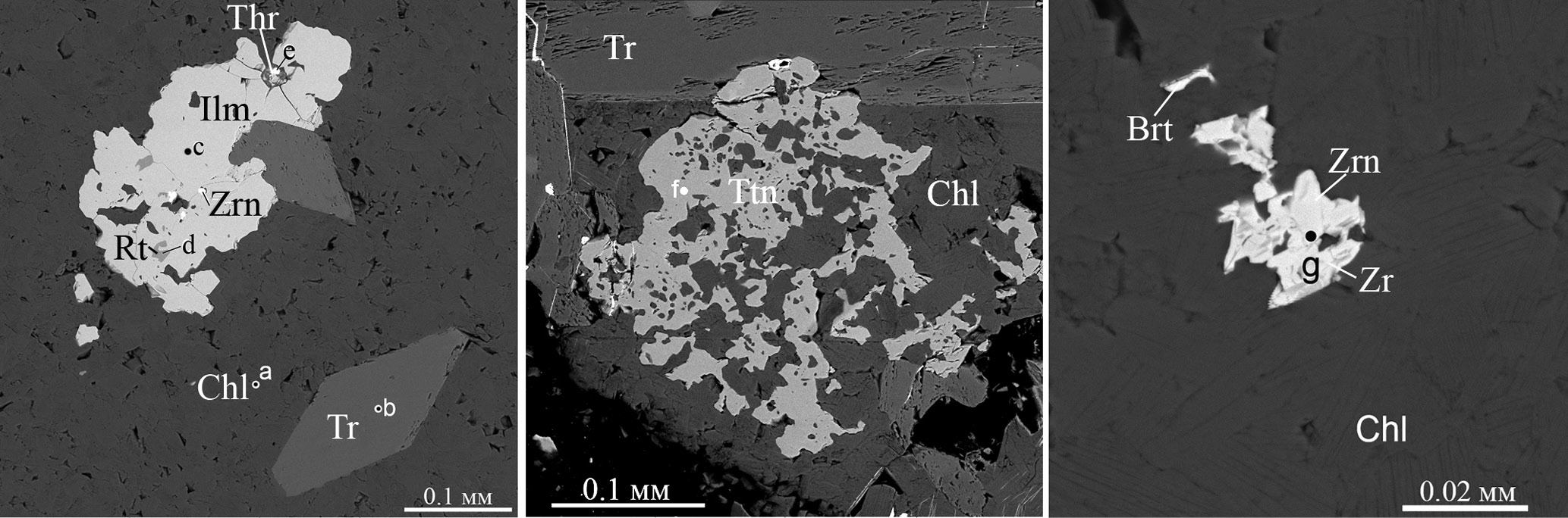 Амфиболовые хлоритолиты (рис. 15б) имеют массивную текстуру и мелкозернистую структуру плотного агрегата клинохлора с порфировыми вкрапленниками призматического тремолита. Второстепенными минералами являются кальцит, ильменит и рутил, акцессорными – циркон, цирконолит, торит, алланит (рис. 17): клинохлор (a, табл. 1, № 2) Mg3.88Fe1.18Al0.94(Si2.96Al1.04)(OH)8, тремолит (b, табл. 1, № 7) Ca2Mg4.67Fe0.33(Si7.87Al0.13)O22(OH)2, тремолит (c, табл. 1, № 8, более железистый) Ca1.9Mg4.32Fe0.78(Si7.88Al0.12)O22(OH)2, ильменит Fe0.95Mn0.03Mg0.02TiO3, циркон (е, табл. 2, № 9) Zr0.94Hf0.03Fe0.03SiO4, рутил (f) Ti0.99Fe0.01O2, кальцит (h) Ca0.99Fe0.01CO3, цирконолит (i, табл. 2, № 1, 2) Ca0.72 Zr0.96Ti1.59Fe0.49Ce0.11Nd0.07Th0.06Sm0.01O7, алланит-(Ce) (k, табл. 2, № 13) (Ca1.16Ce0.36Nd0.20La0.10 Pr0.04Mg0.14)(Al1.98Fe0.99)(SiO4)(Si2O7)O(OH). Все минералы имеют индукционные границы одновременного роста, тремолит и клинохлор зональны с более железистой периферией. Рутил с ильменитом нередко образуют синтаксические срастания. В алланите видна зональность и секториальность состава, встречаются участки ферроалланита.