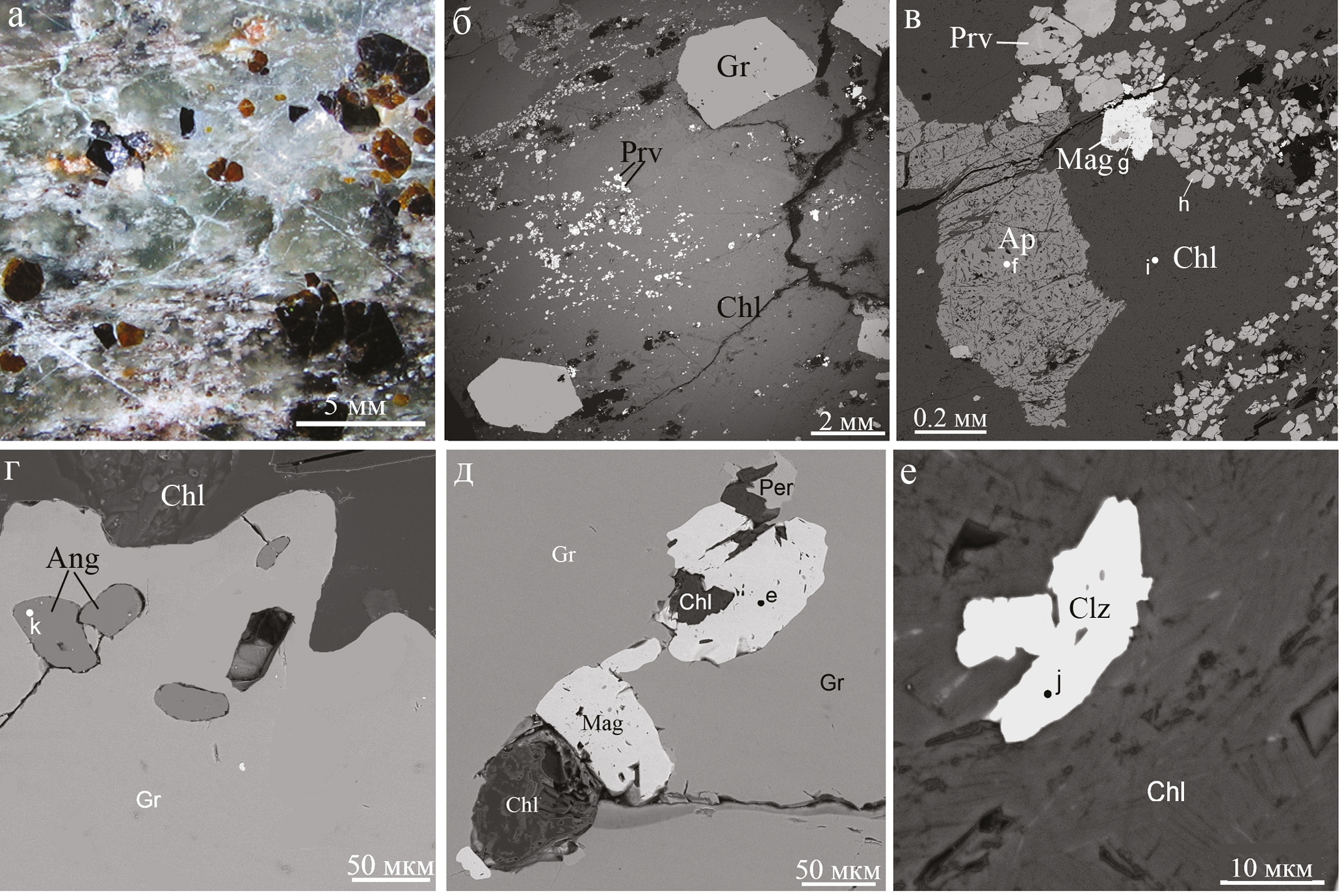 Рис. 25. Минералы и структуры гранат-хлоритовой породы Шишимской копи: а – косое освещение; б–е – BSE фото.