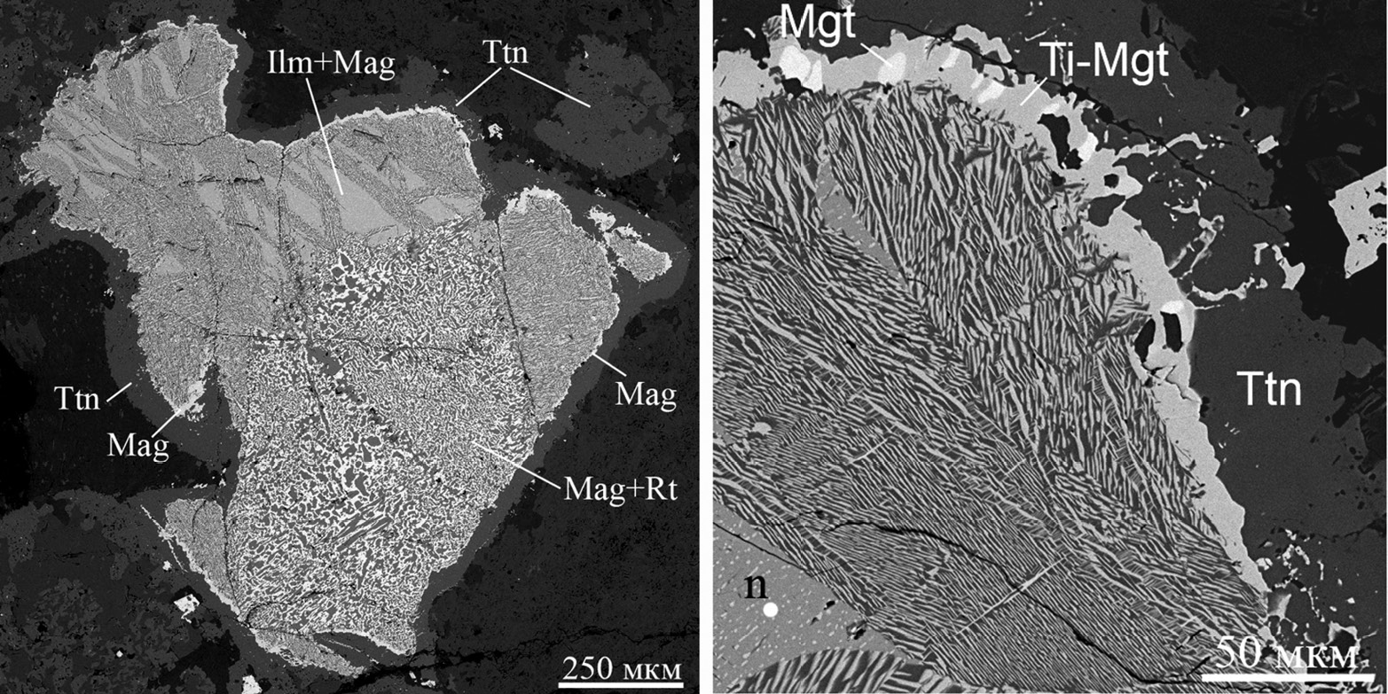 Fig. 9. Replacement of ilmenite-magnetite aggregate (n) by rutile-magnetite syntactic aggregate along fractures: left – general view of partial pseudomorphosis; right – fragment with a crust of magnetite-titanomagnetite aggregate and titanite aggregate. Here and in Figs. 10–12, 13б, 16–18, 20, 21, 23 – BSE images.