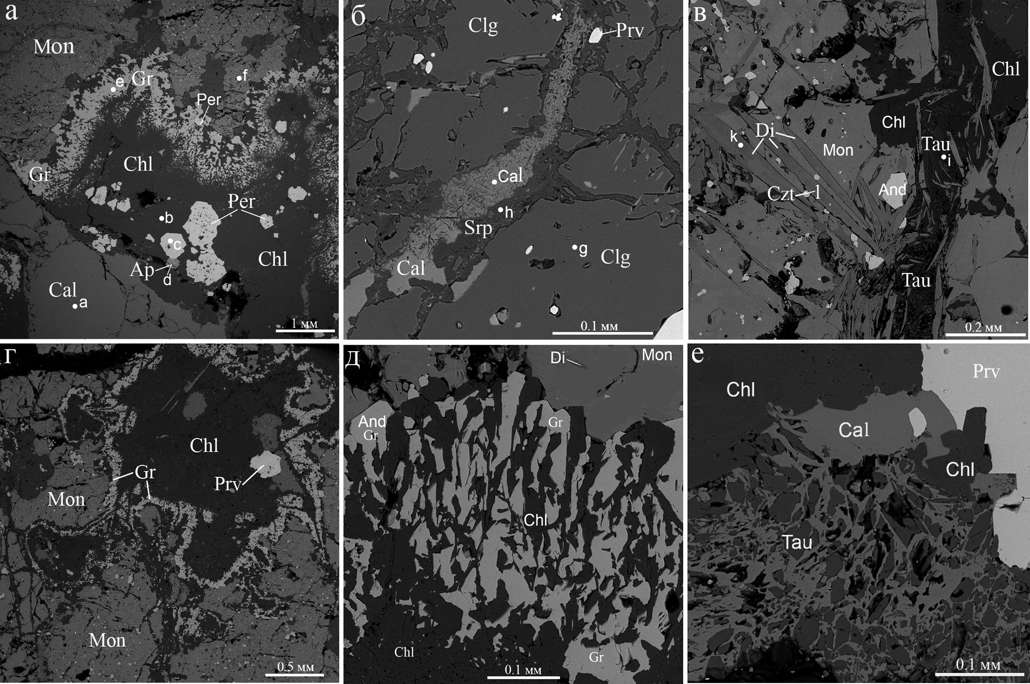 На рисунках использованы следующие аббревиатуры: Aln – алланит-(Ce), Amf – амфибол, And – андрадит, Ap – апатит, Bdy – бадделеит, Brc – брусит, Brt – барит, Ca, Cal – кальцит, Chl – хлорит, Chu – клиногумит, Clg – гидроксилклиногумит, Czt, Clz – кальциртит, Di – диопсид, Ep – эпидот, Gk – гейкилит, Gr – гроссуляр, Ilm – ильменит, Mag, Mgt – магнетит, Mon – монтичеллит, Prv – перовскит, Rt – рутил, Srp – серпентин, Tau – таумасит, Thm – томсонит-Са, Ti-Mgt – титаномагнетит, Tr – тремолит, Ttn, Tnt – титанит, Val –валлериит, Vez – везувиан, Zr – циркон, Zrl, Zrn – цирконолит.