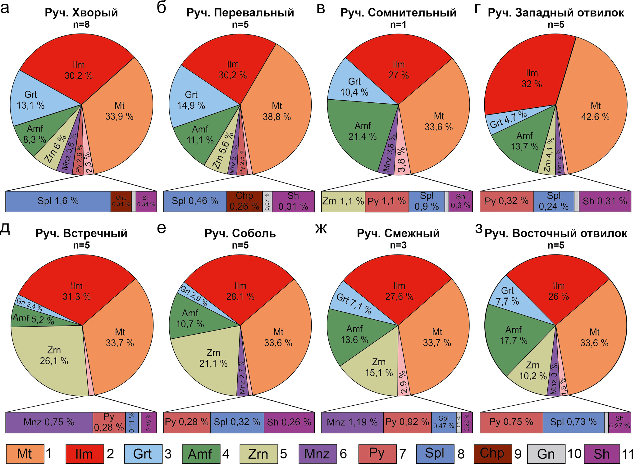 Fig. 2. Average mineral composition of heavy concentrates from tributaries of the Anmandykan 2nd Creek: а–з – creeks: а – Khvory; б – Perevalny; в – Somnitelny; г – Zapadniy otvilok; д –Vstrechny; е – Sobol; ж – Smezhny; з – Vostochniy otvilok. n – number of samples.
