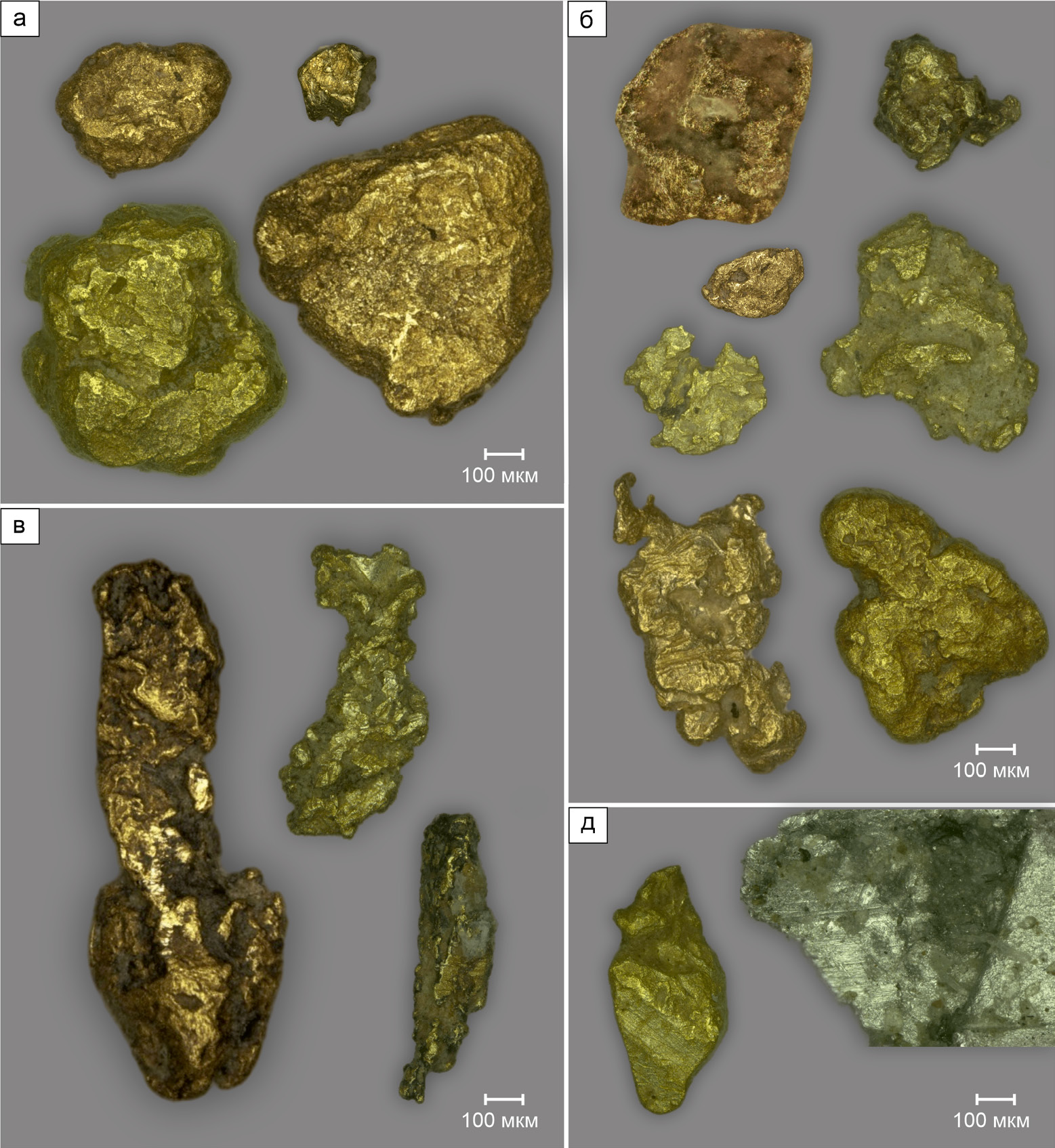 Fig. 3. Native gold of various morphology from heavy concentrates of tributaries of the Anmandykan 2nd Creek: a – isometric, medium-rounded; б – lumpy, poorly rounded; в – elongated; д – with hatch marks.