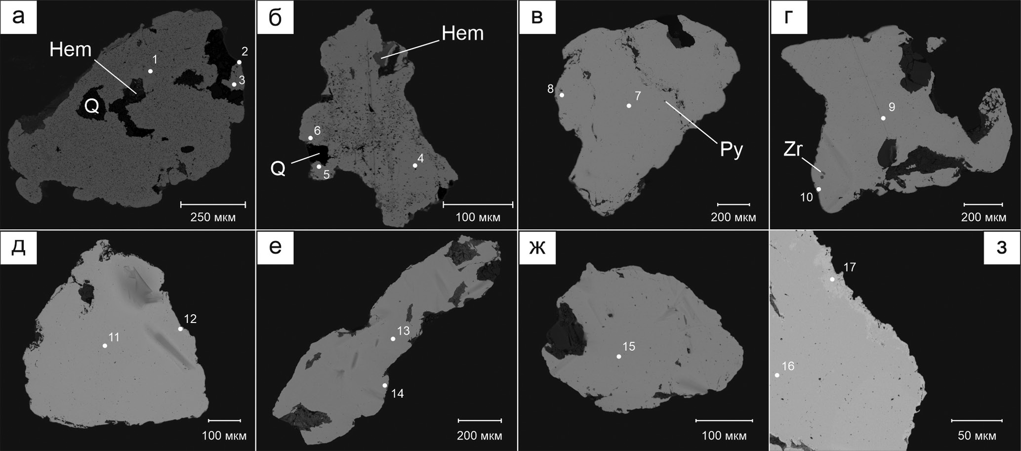 Fig. 4. BSE images of gold grains sampled from tributaries of the Anmandykan 2nd Creek: а–г – Khvory; д–е – Vostochniy otvilok; ж – Perevalny; з – Somnitelny.