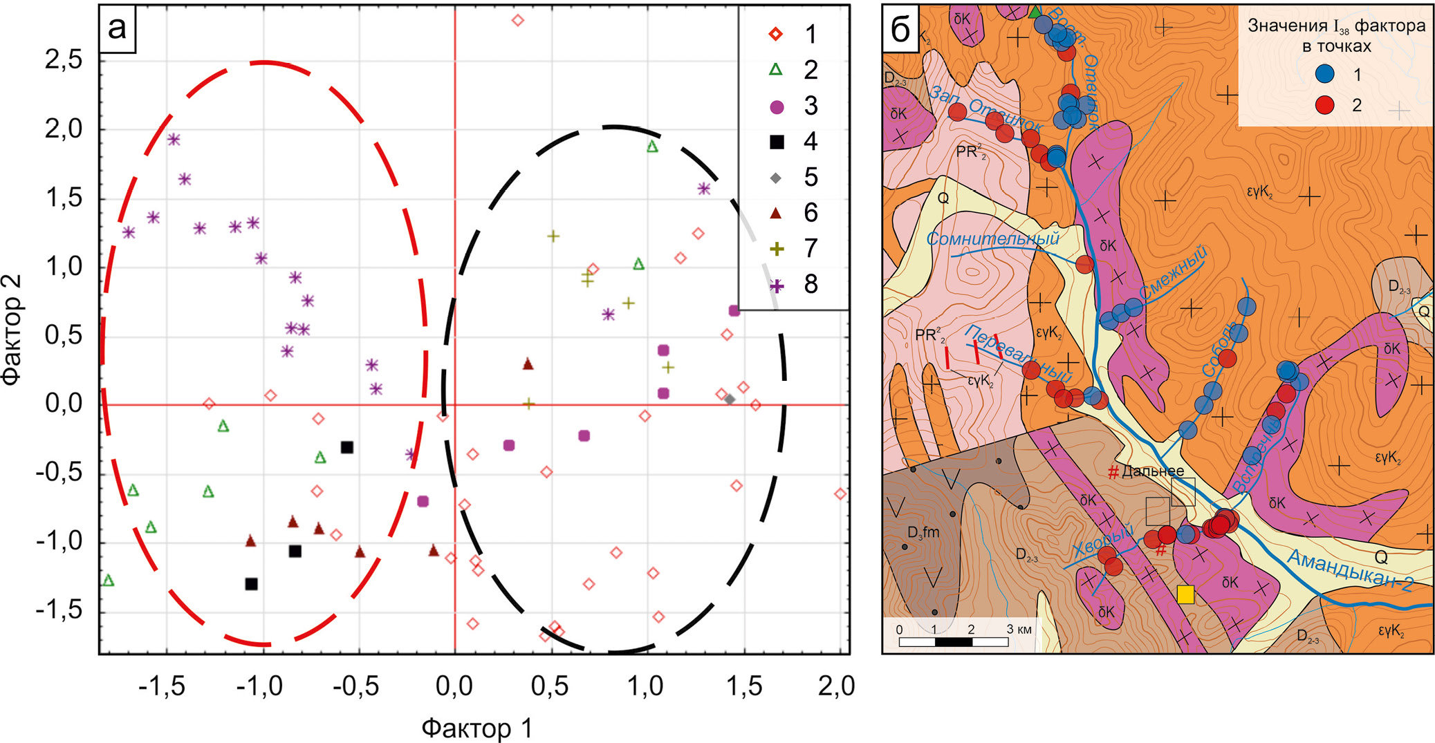 Fig. 9. a – diagram of values of factors I and II in the points: black line – positive values of factor I (K, Sr, As, Si, Au, Cu, Ca), red line – negative values of factor I (Fe, Bi, Pb, P, Mg, Mn, Zr); б – schematic map of values of factor I in sampling points (here and in Figs. 10, 11): negative (1) and positive (2) values. Creeks: 1 – Khvory; 2 – Vstrechny; 3 – Perevalny; 4 – Smezhny. 5 – Somnitelny; 6 – Sobol; 7 – Zapadniy otvilok; 8 – Vostochniy otvilok.