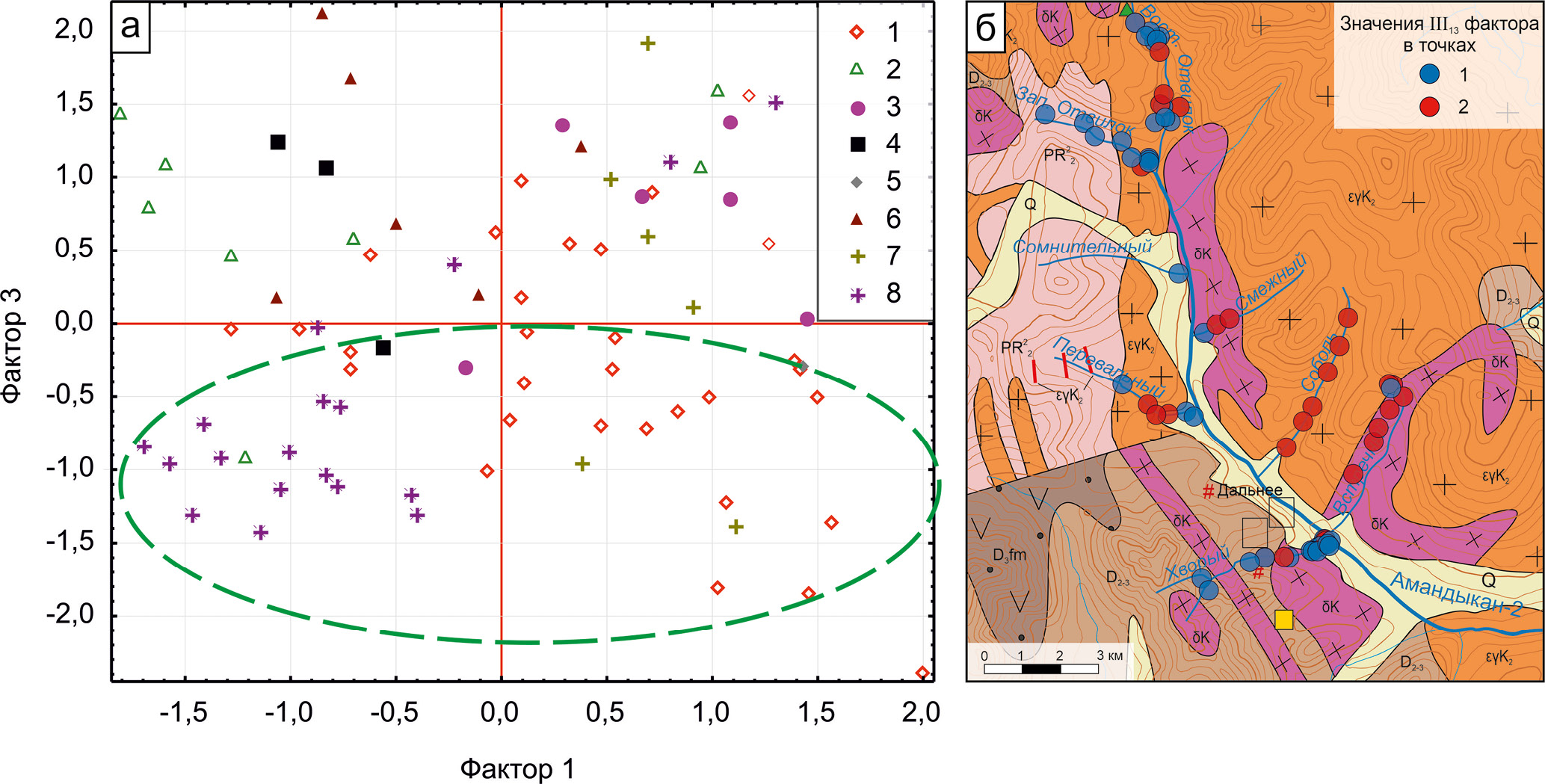 Рис. 11. а – диаграмма значений факторов I и III: зеленая линия – отрицательные нагрузки фактора III (Al, Si, Mg, Sr, Au, Ca, As, Rb, Fe); б – картосхема значений фактора III в точках отбора шлиховых проб.