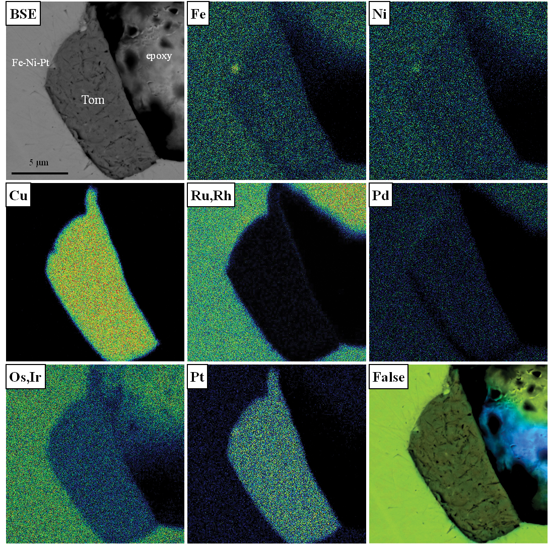 Томамаэит во включениях имеет относительно однородный состав, но иногда он содержит субмикронные образования Fe-Ni-Pt сплава (рис. 2, 3), которые располагаются либо в пределах зерен, либо на границе с минералом-хозяином. Изученный томамаэит имеет состав, близкий к идеальной формуле Cu3Pt, и содержит незначительные примеси Pd (до 2.0 мас. %), Ir (до 1.7 мас. %), Ru и Ni (до 0.6 мас. %) и Fe (до 0.2 мас. %) (табл. 3).