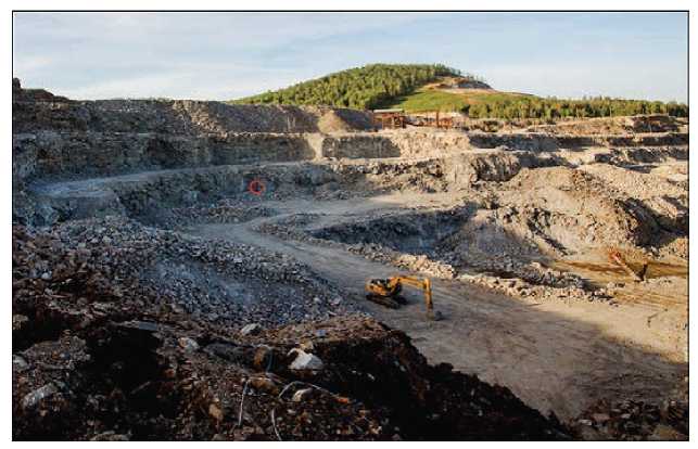 Fig. 1. |Northwestern part of the Polevoshpatovy (Fedlspar) quarry at Mt. Dolgaya in 2014 and the ledge of a horizon of 372 m.