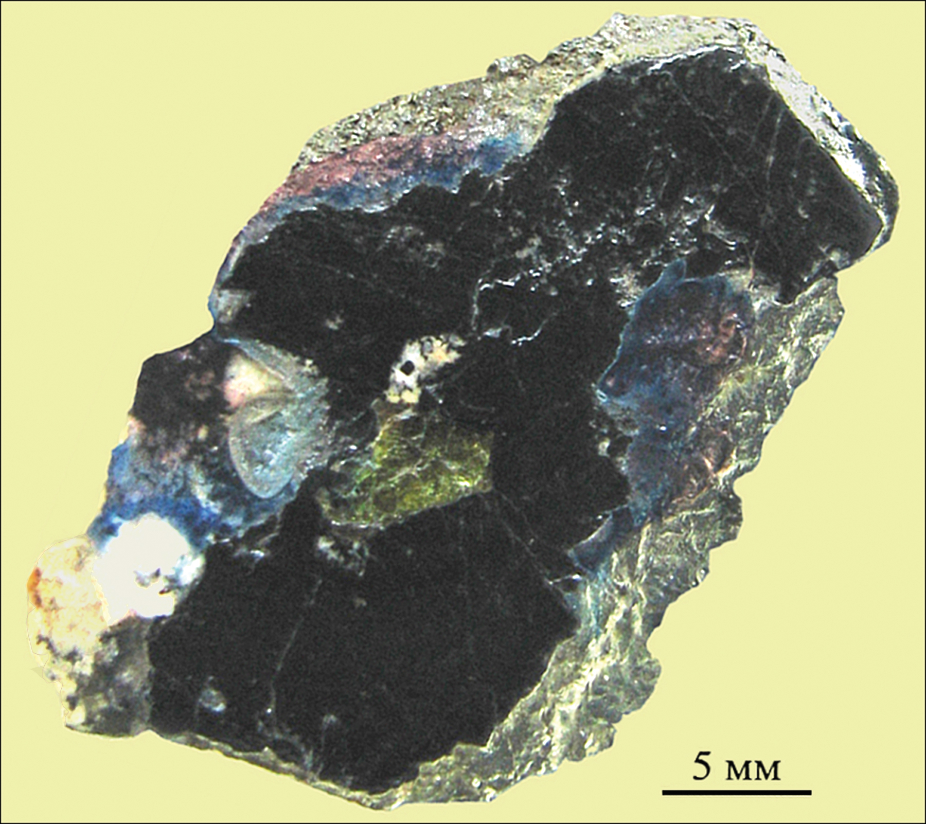 Fig. 2. Grain of altered yellowish green «uranpyrochlore» (in the center) in ilmenite (black) with small inclusions of feldspars, annite, brown fluorocalciopyrochlore, fersmite, galena and zeolites.