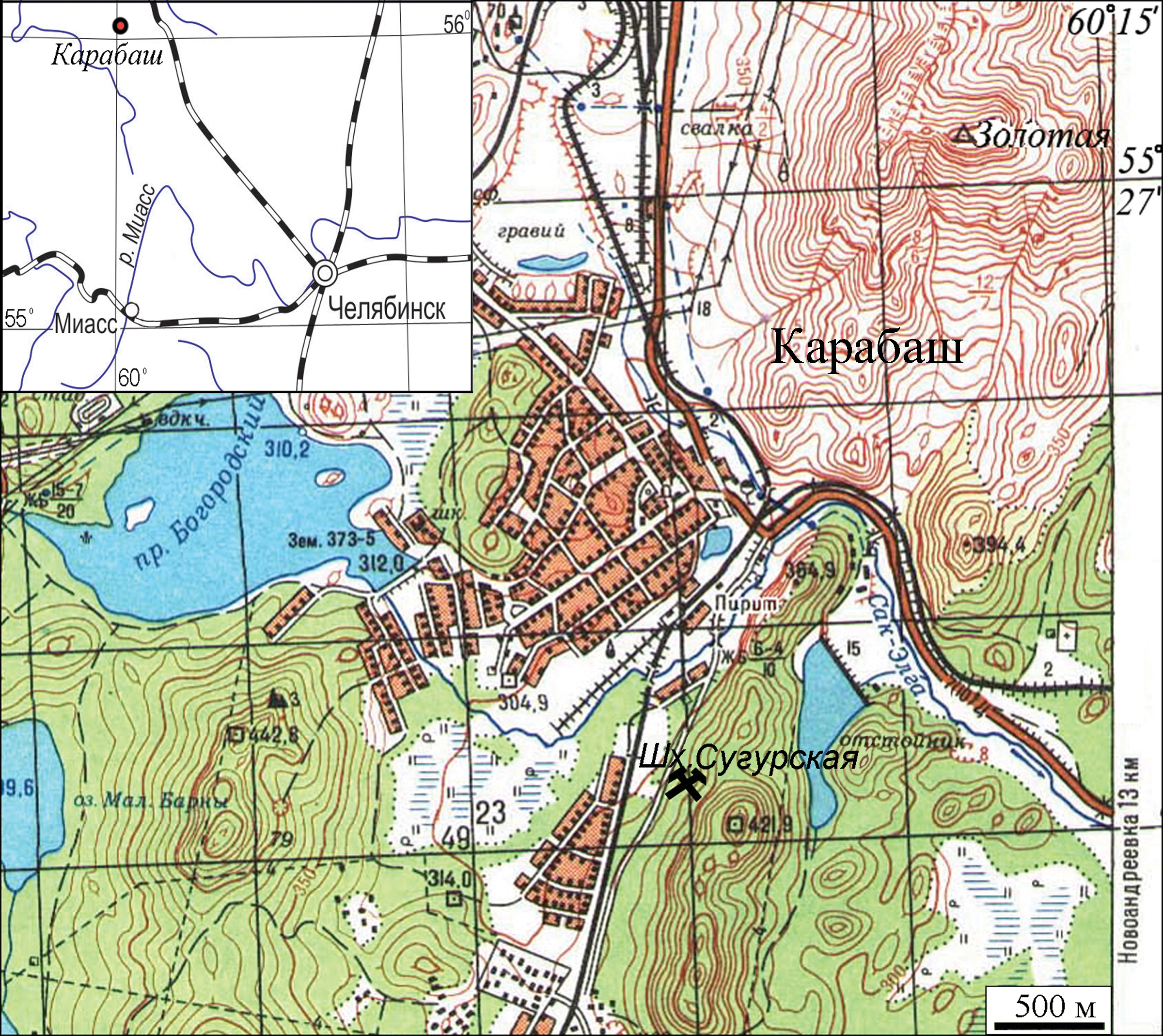 Сугурское месторождение медных руд известно с 1823 г. и находится на северо-западном склоне Сугурских гор на южной окраине г. Карабаш на Южном Урале (рис. 1). Карабашские медные проявления, приуроченные к контакту известняков с серпентинитами Соймоновской долины, были известны задолго до находки колчеданных месторождений в зеленосланцевой толще. В геологическом очерке месторождений медных руд на Урале А.Н. Заварицкий (1927) отмечал, что Сугурское месторождение вызывает несомненно большой теоретический интерес. Шахта Сугурская по распоряжению заводчика Л.И. Расторгуева была пройдена в 1837 г. до глубины 50 м с рассечками на горизонтах 20, 32, 42 и 57 м от устья шахты. Отрабатывались окисленные медные руды с малахитом и самородной медью; в 1840 г. шахта была затоплена (Малий, 1940ф). В 1907 г. шахта откачивалась Кыштымским горным обществом. В 1911–1912 гг. месторождение находилось в английской концессии, шахта была углублена до 87 м, но руды признаны невыгодными, и шахту затопили. Полученные геологические данные (Stikney, 1915) кратко приведены А.Н. Заварицким (1927).