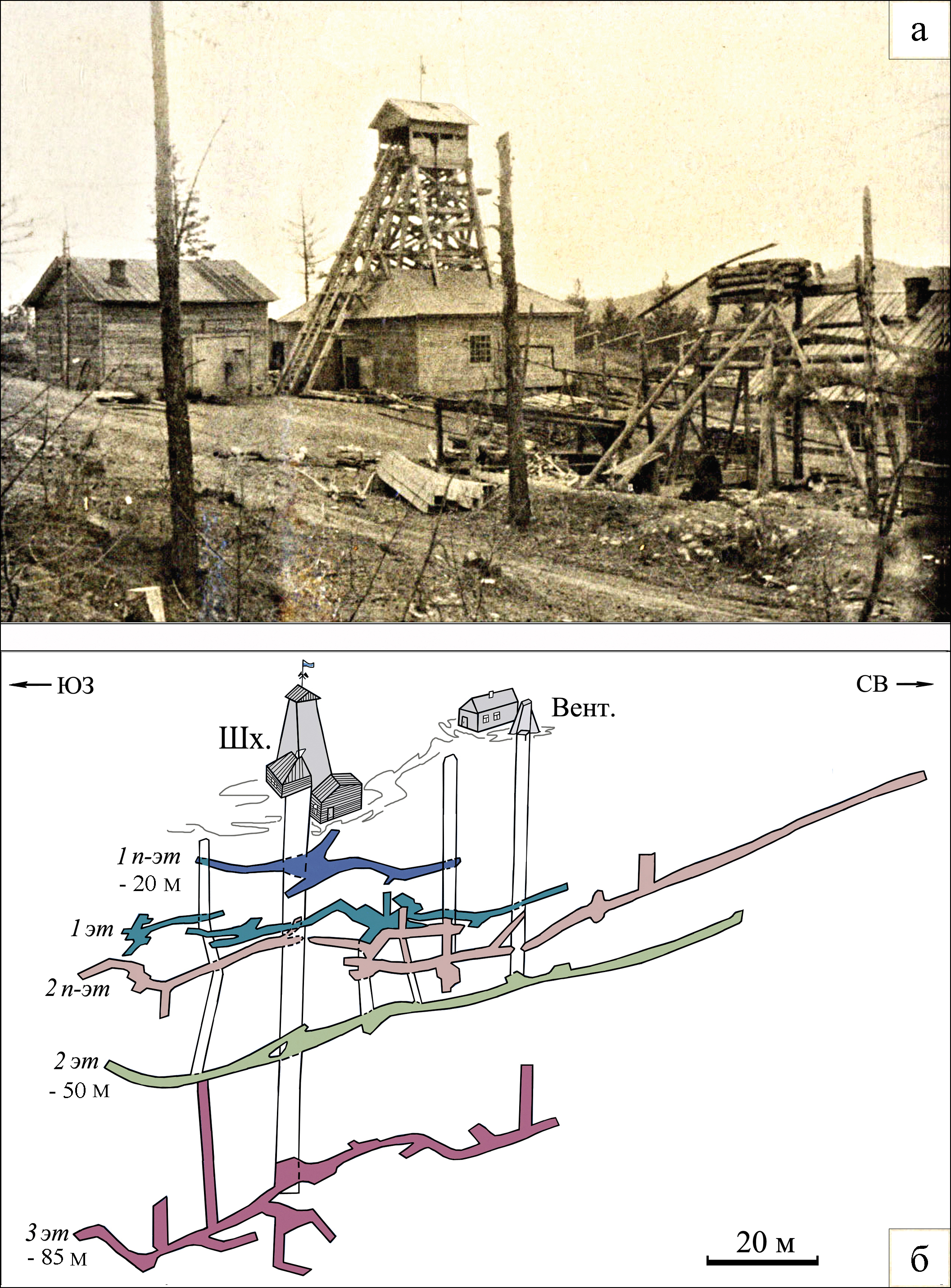 Fig. 2. Sugur mine with buildings in 1938 (а) and scheme of the underground mines (б) after (Maliy, 1940ф).