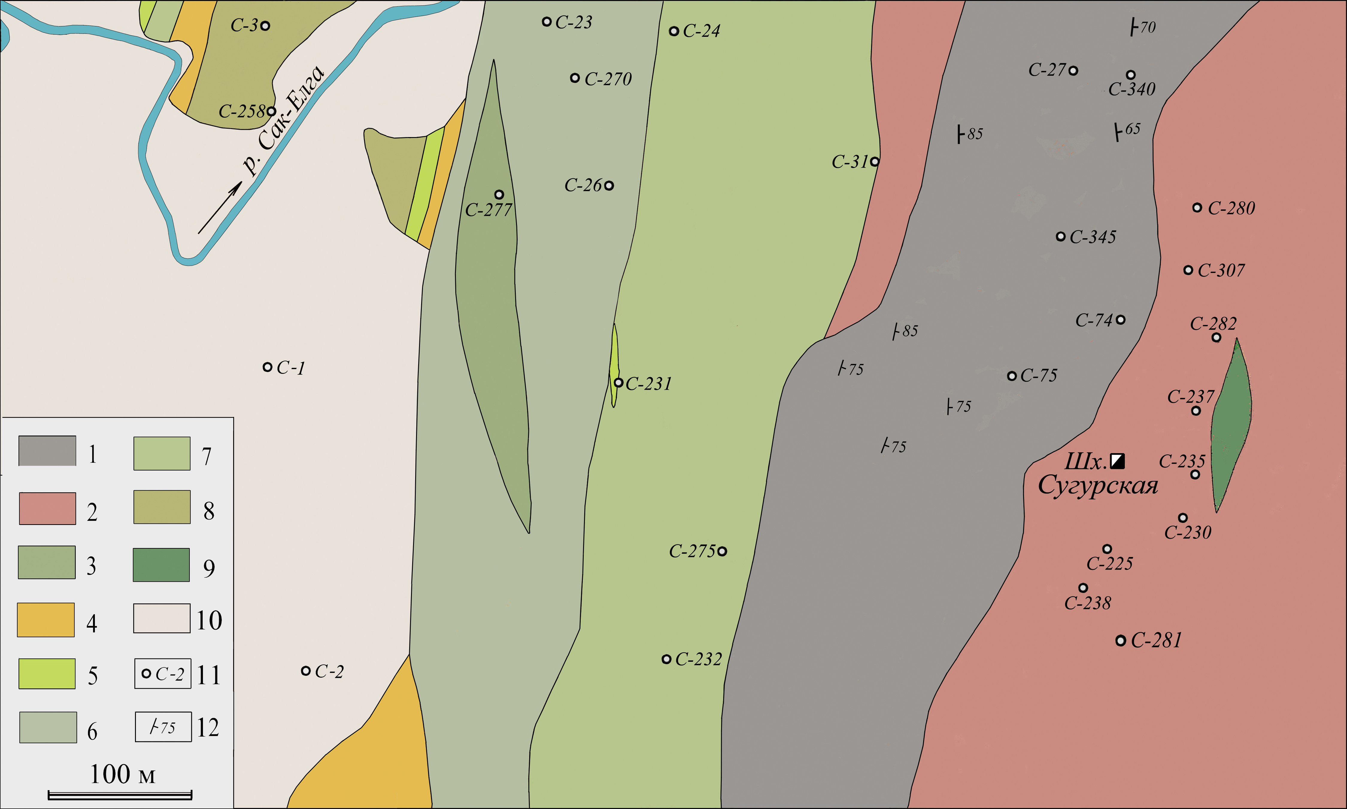Fig. 3. Geological scheme of the Sugur deposit, modified after (Maliy, 1940ф).