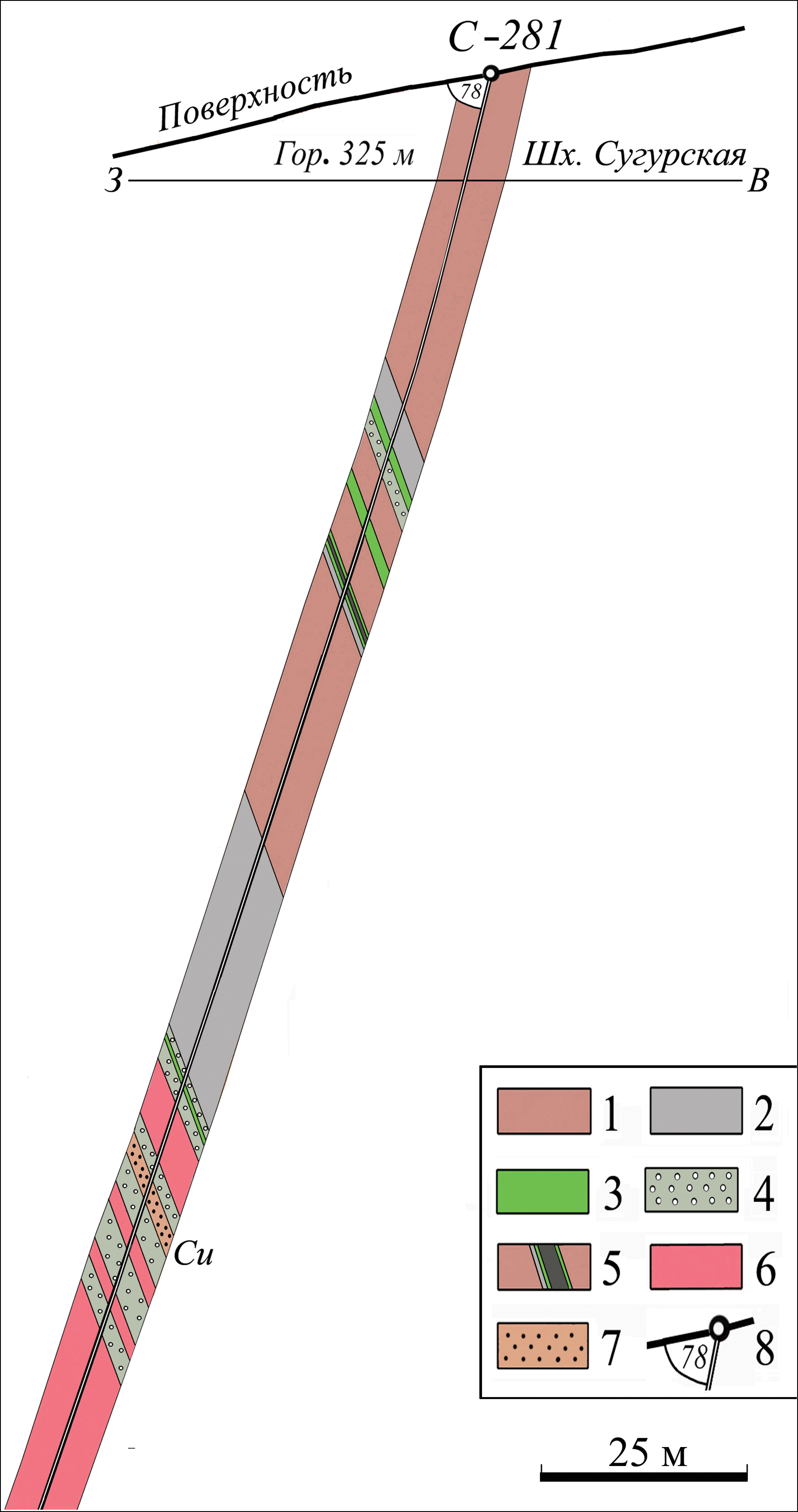 1 – серпентиниты; 2 – карбонатные породы; 3 – эпидот-хлоритовые сланцы; 4 – скарны; 5 – серный колчедан; 6 – гранит-порфиры; 7 – густая вкрапленность сульфидов; 8 – угол наклона скважины.