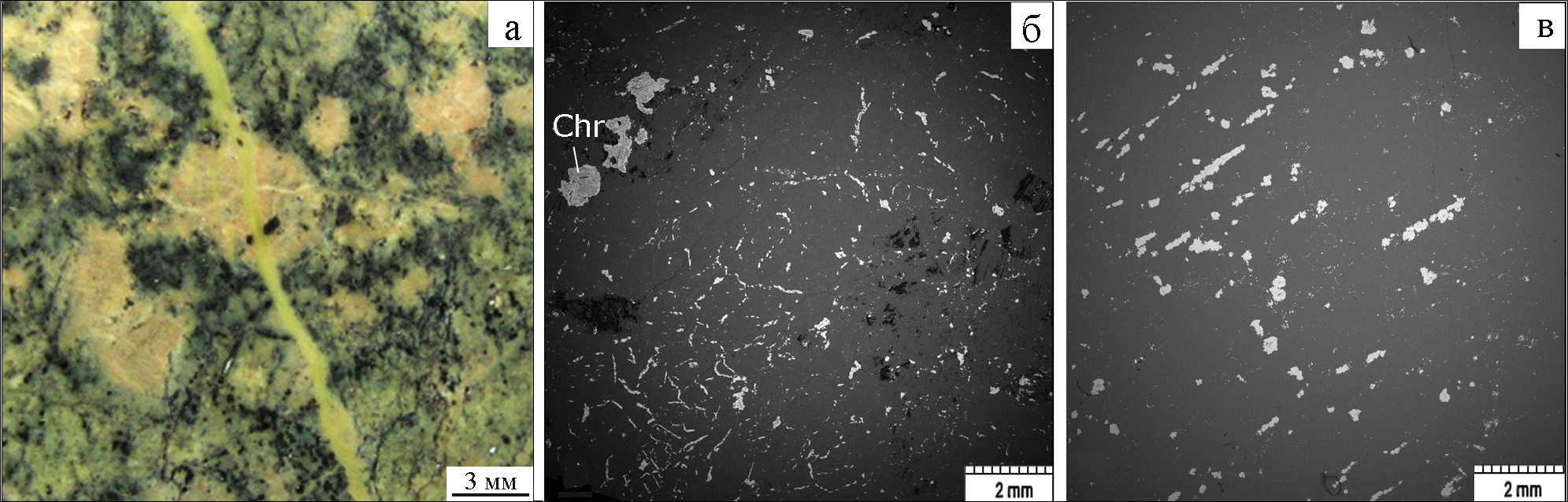 Fig. 5. Serpentinite with pseudomorphic chrysotile after enstatite with ophite veinlets (а); magnetite metacrystals (white) in serpentinized dunite with chromite (Chr) (б); magnetite metacrystals (white) along cleavage of serpentinized enstatite (bastite) (в).