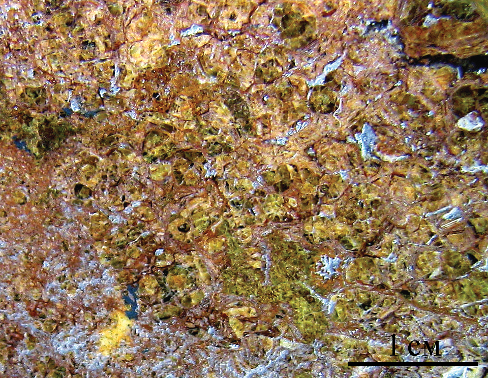 Fig. 12. Garnet «sand»: andradite (light green) in porous limonite (yellow-brown) with quartz and gypsum in cavities (light gray).