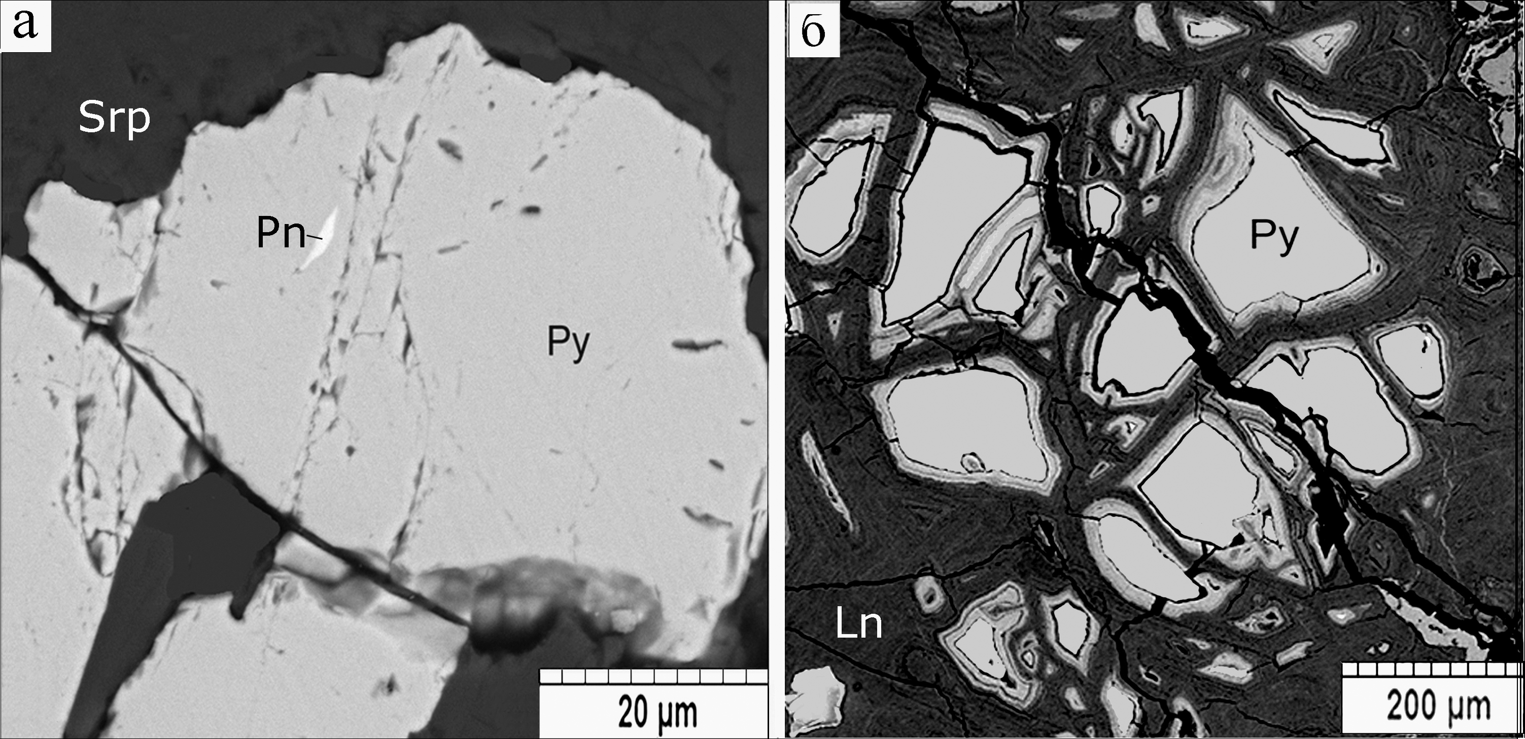 Fig. 13. Co-bearing pyrite (Py) with pentlandite inclusion (Pn) in serpentinite (а) and zoned pseudomorphic limonite (Ln) after pyrite (б).