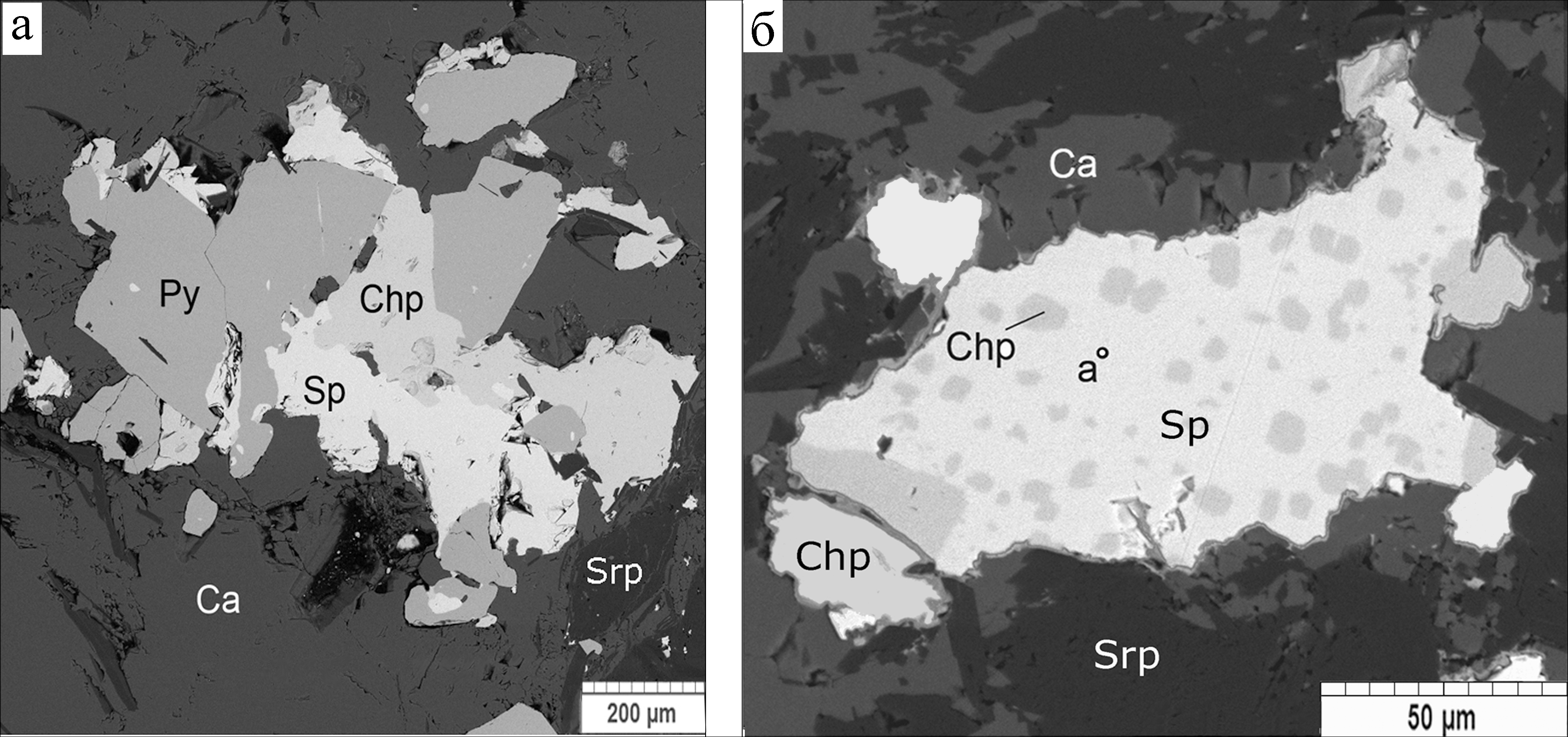 Fig. 15. Assemblage of sphalerite (Sp), chalcopyrite (Chp), and pyrite (Py) with calcite (Ca) in serpentine-bearing carbonatite (а); syntactic intergrowth of sphalerite with chalcopyrite in carbonatite with serpentine (Srp) (б).