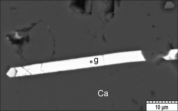 Рис. 17. Бадделеит (g) в кальцитовом карбонатите (Ca).
