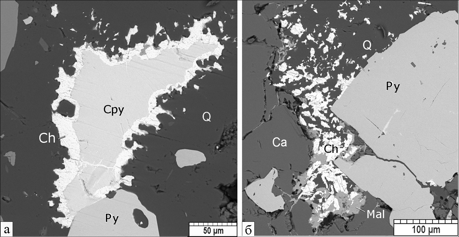 Рис. 19. Частичная псевдоморфоза халькозина (Ch) по халькопириту (Cpy) в агрегате с пиритом (Py) и кварцем (Q) (а); псевдоморфоза халькозина с малахитом (Mal) по халькопириту в пирит-кальцитовом агрегате (Ca) (б).