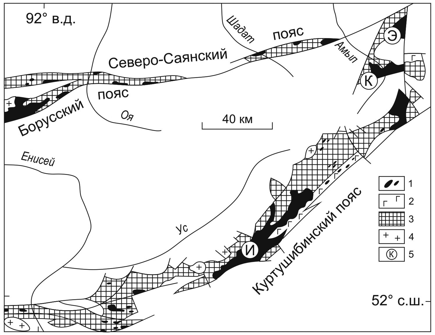 1 – ультрабазиты; 2 – габброиды, дайковый комплекс; 3 – диабазовая толща, углисто-кремнистые сланцы (чингинская и нижнемонокская свиты); 4 – посторогенные граниты; 5 – ультрабазитовые массивы (И – Иджимский, К – Калнинский, Э – Эргакский).