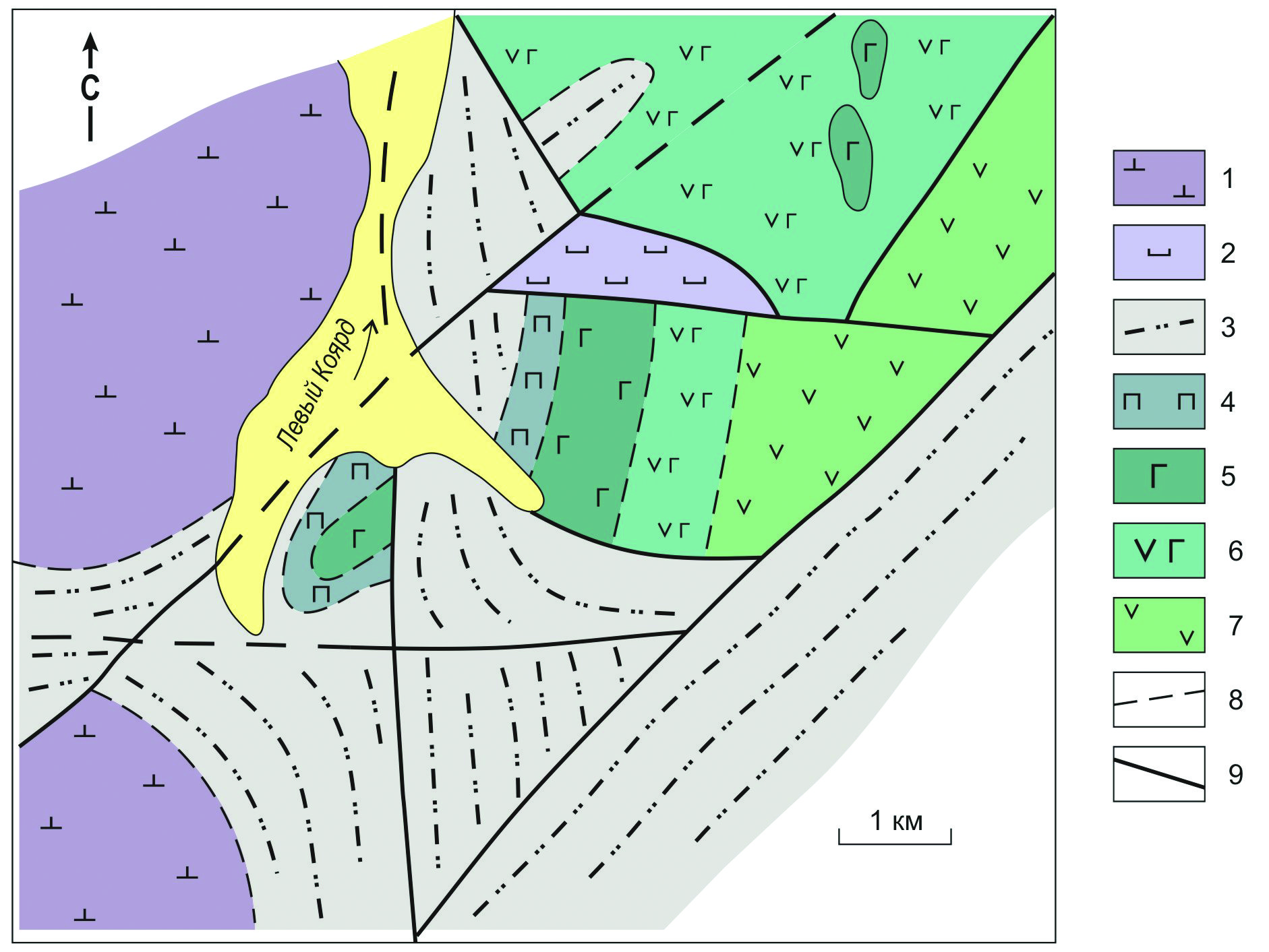 1 – дуниты, гарцбургиты; 2 – серпентиниты; 3 – метаэффузивы, углисто-кремнистые сланцы (чингинская свита); 4 – переходный расслоенный дунит (серпентинит)-верлит-клинопироксенитовый комплекс; 5 – габброиды; 6 – дайковый диабазовый комплекс; 7 – эффузивно-осадочная толща офиолитов; 8 – примерные границы; 9 – разломы.